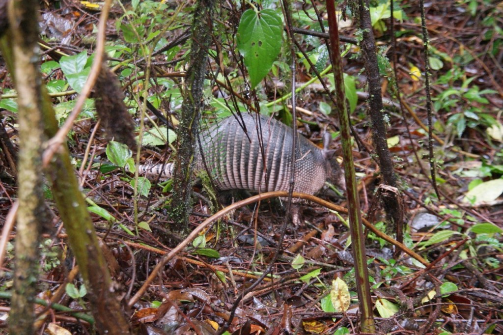 Unser erstes Ziel auf dem Festland war die Region rund um den Monteverde Nationalpark, der für seinen ursprünglichen Dschungel bekannt ist. Hier im Hochland prallen tropisch feuchtwarme karibische und pazifische Luftmassen aufeinander, was 11 Monate im Jahr für nebeliges und regnerisches Wetter sorgt. Luftfeuchtigkeit immer knapp unter 100%, aber dafür die Temperaturen mit ca. 21 C moderater. Wir waren zeitweise die einzigen Besucher im Park, der mit seinen engen Dschungelpfaden und unzähligen exotischen Planzen einen sehr ursprünglichen Einblick gab. Wir entdeckten u.a. ein faszinierend aussehendes Neunbinden–Gürteltier.