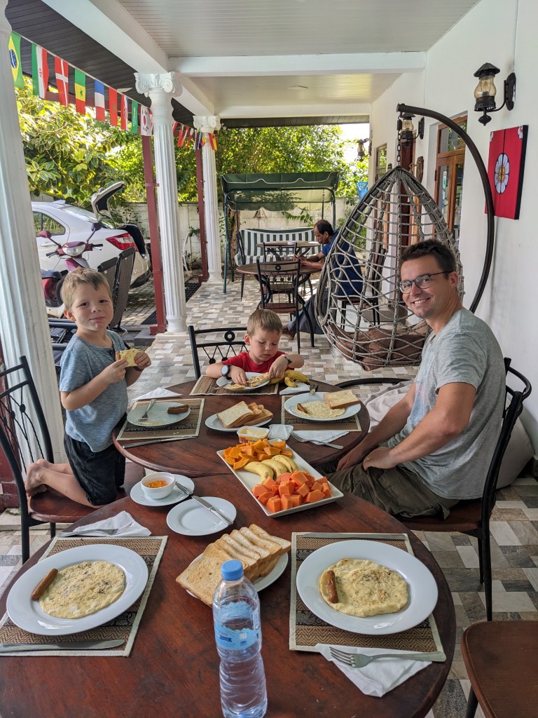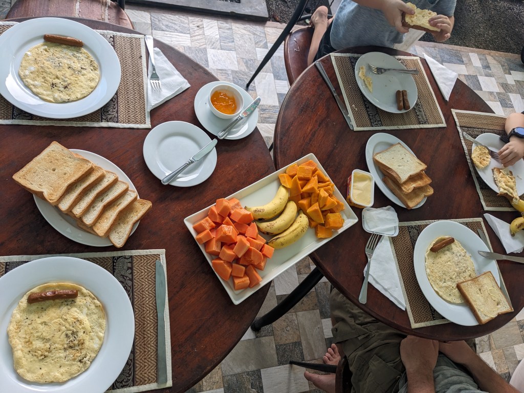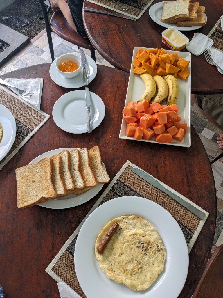 Auf der Weiterfahrt an die Ostküste entdeckten wir unseren ersten wilden Elefanten, den wir lange entlang der Straße beobachten konnten. Zum Frühstück gab es meistens Obst, Pfandkuchen mit Kokosraspeln, Omlett und Toastbrot und Abends Fisch oder Meeresfrüchte.