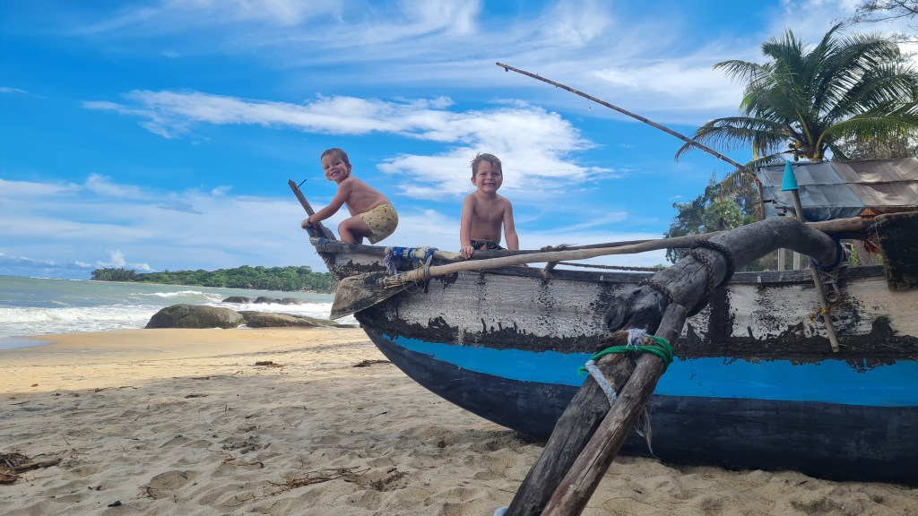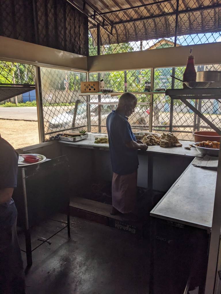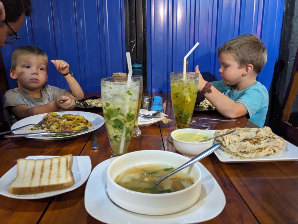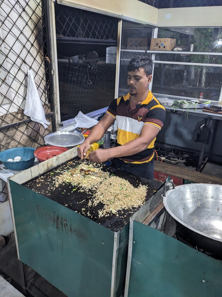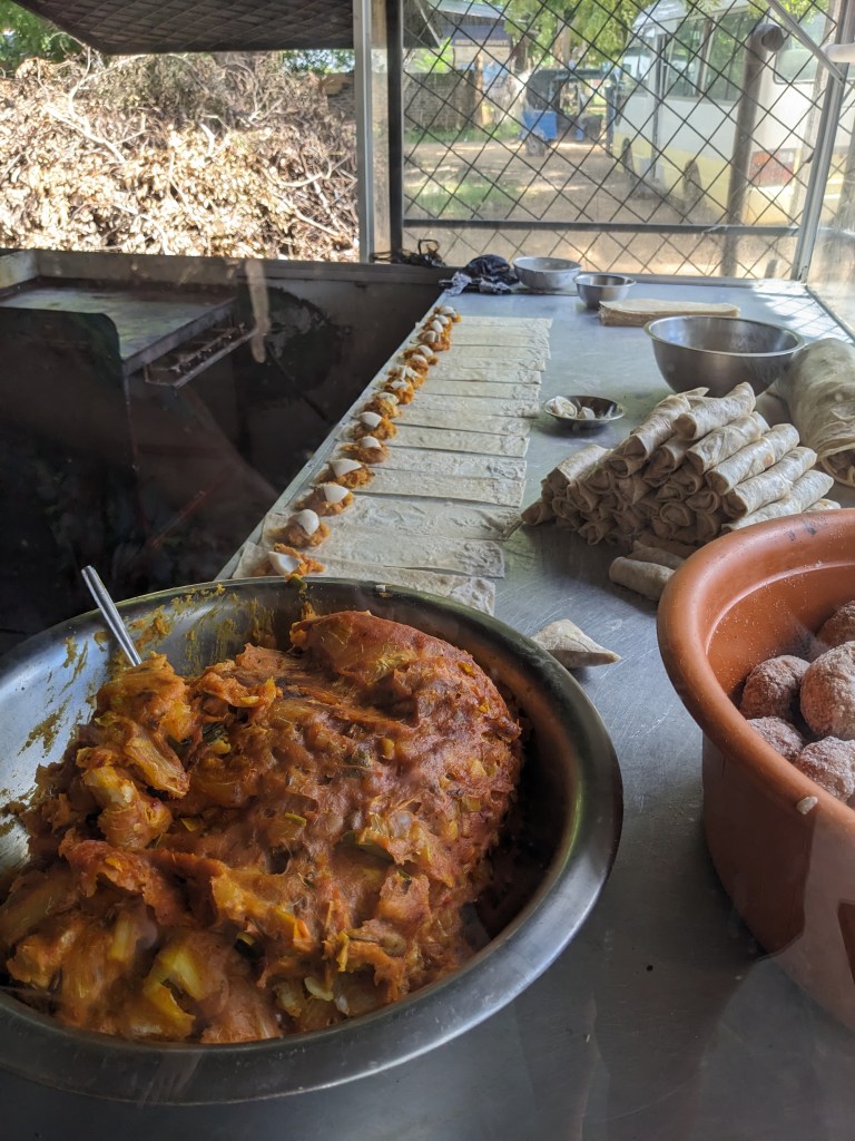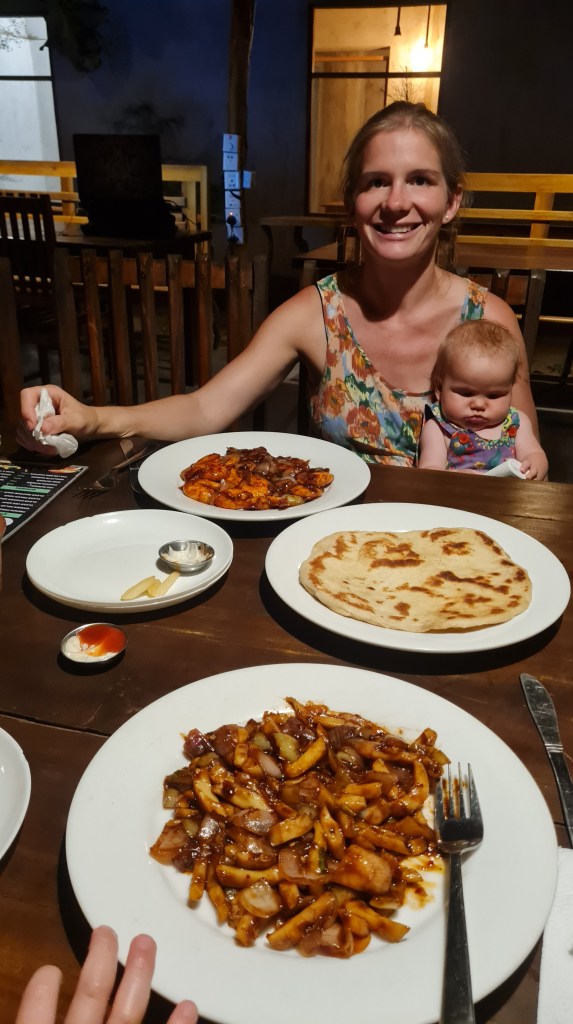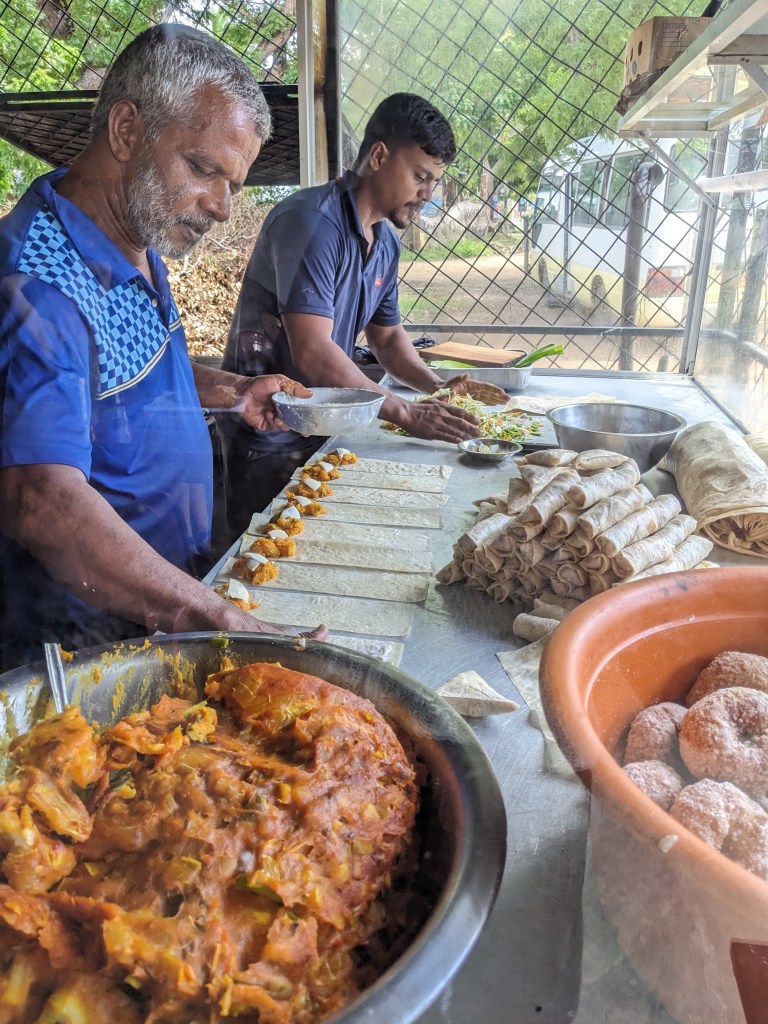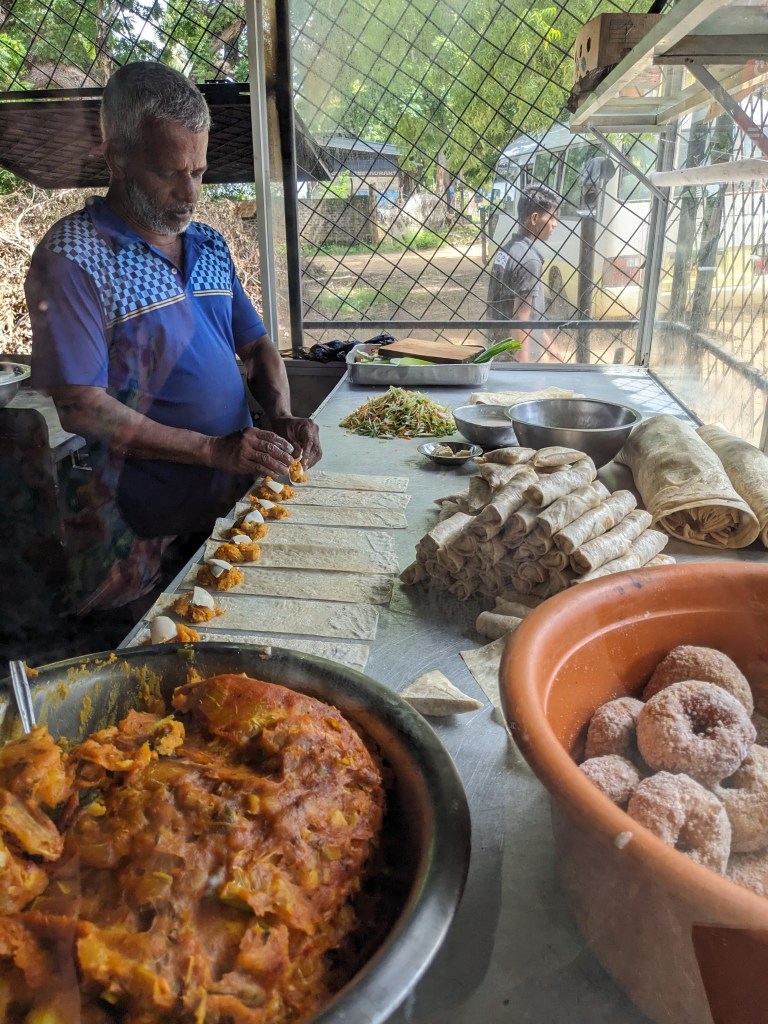 Traditionelle Essenzubereitung von „Kottu“ (in Streifen geschnittenes, klein gehacktes und angebratenes Brot, mit Gemüse/Fisch/Fleisch) und „Roti“ (Fladenbrot) Teig welcher mit allem möglichen wie Maniok, Eiern, Gemüse und Fleisch gefüllt und manchmal frittiert wird. Fast alle Speisen sind richtig scharf 🌶️ sonst rühren es die Einheimischen nicht an. Selbst die Kinder essen hier schon richtig scharf. Emil kann schon für seine Verhältnisse richtig scharf essen. Aber die Schärfe verschwindet interessanterweise auch sehr schnell wieder. Man kann jederzeit mit Chili nachschärfen. Es gibt hier Chili in allen Varianten, doch unser Highlight ist karamellisierte Chilipaste.