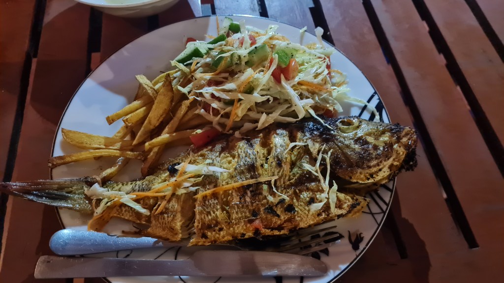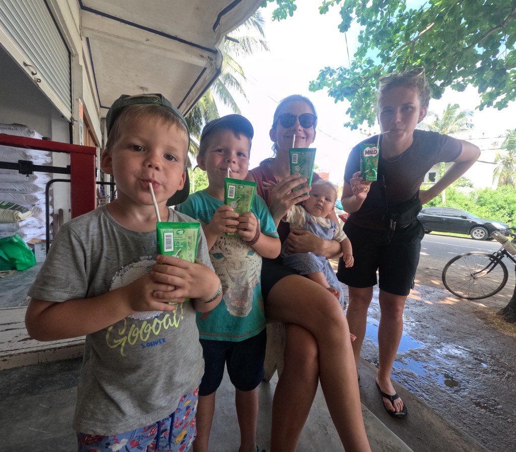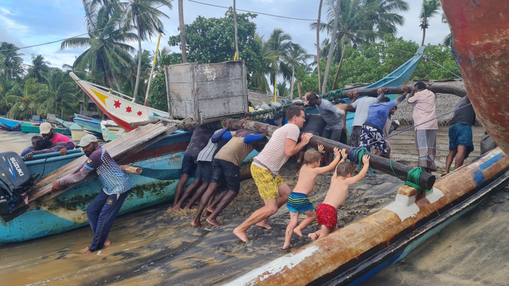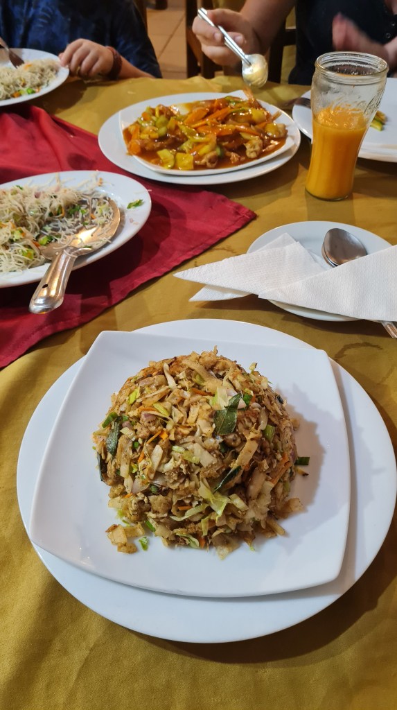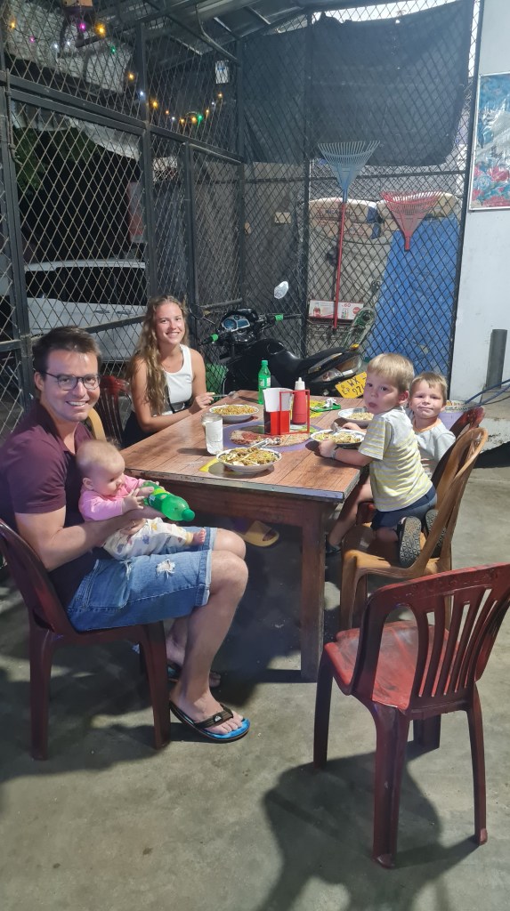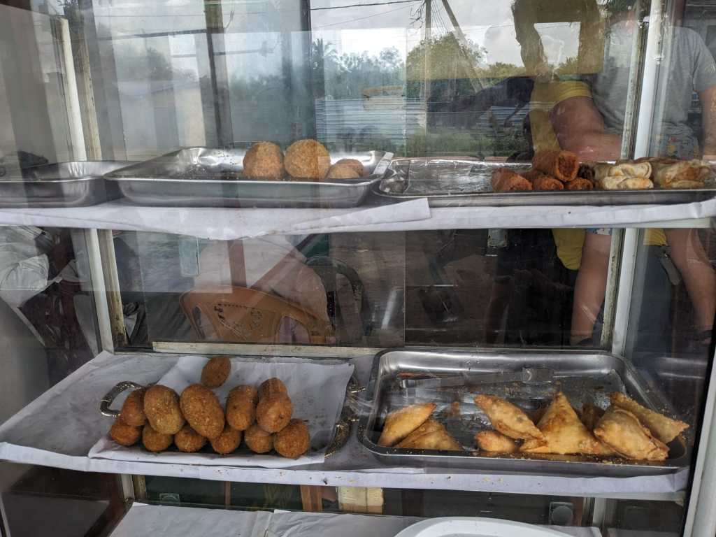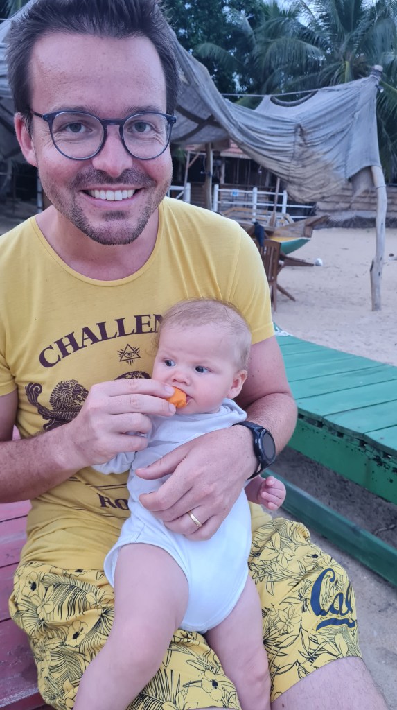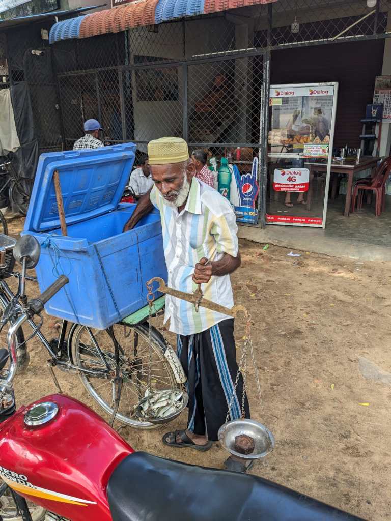 Traditionelle Essenzubereitung von „Kottu“ (in Streifen geschnittenes, klein gehacktes und angebratenes Brot, mit Gemüse/Fisch/Fleisch) und „Roti“ (Fladenbrot) Teig welcher mit allem möglichen wie Maniok, Eiern, Gemüse und Fleisch gefüllt und manchmal frittiert wird. Fast alle Speisen sind richtig scharf 🌶️ sonst rühren es die Einheimischen nicht an. Selbst die Kinder essen hier schon richtig scharf. Emil kann schon für seine Verhältnisse richtig scharf essen. Aber die Schärfe verschwindet interessanterweise auch sehr schnell wieder. Man kann jederzeit mit Chili nachschärfen. Es gibt hier Chili in allen Varianten, doch unser Highlight ist karamellisierte Chilipaste.