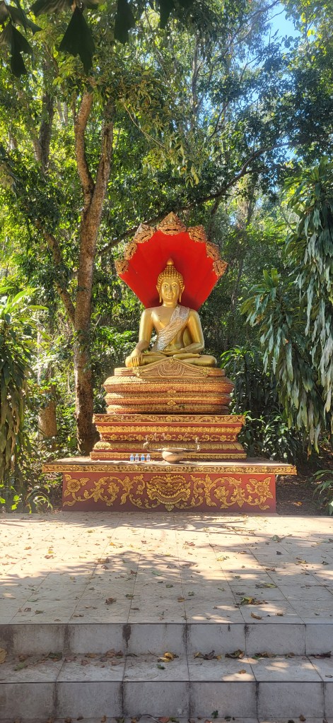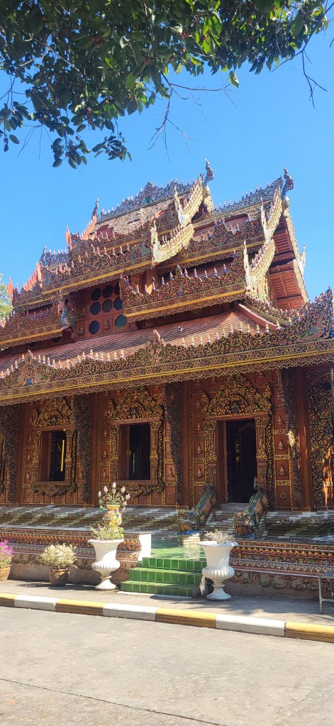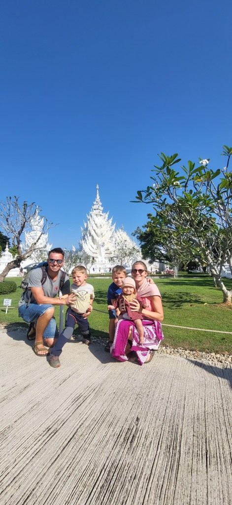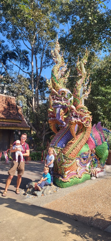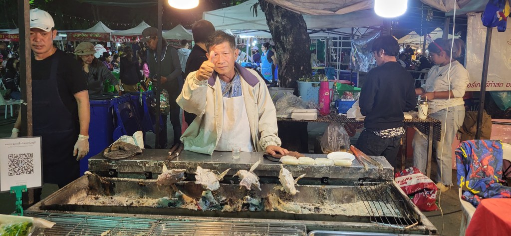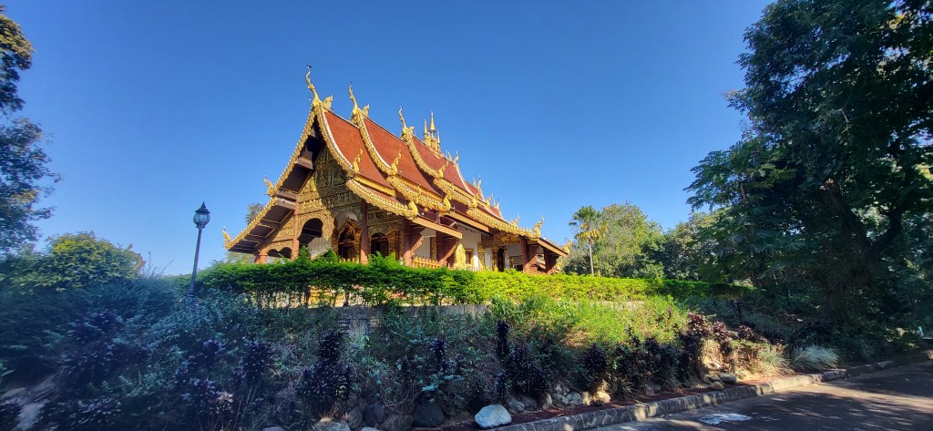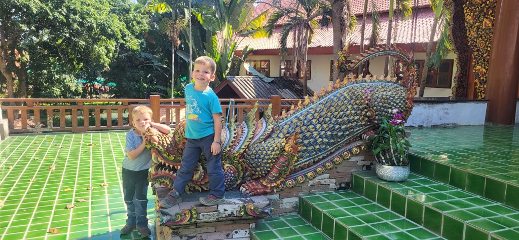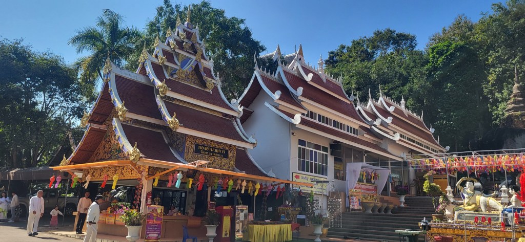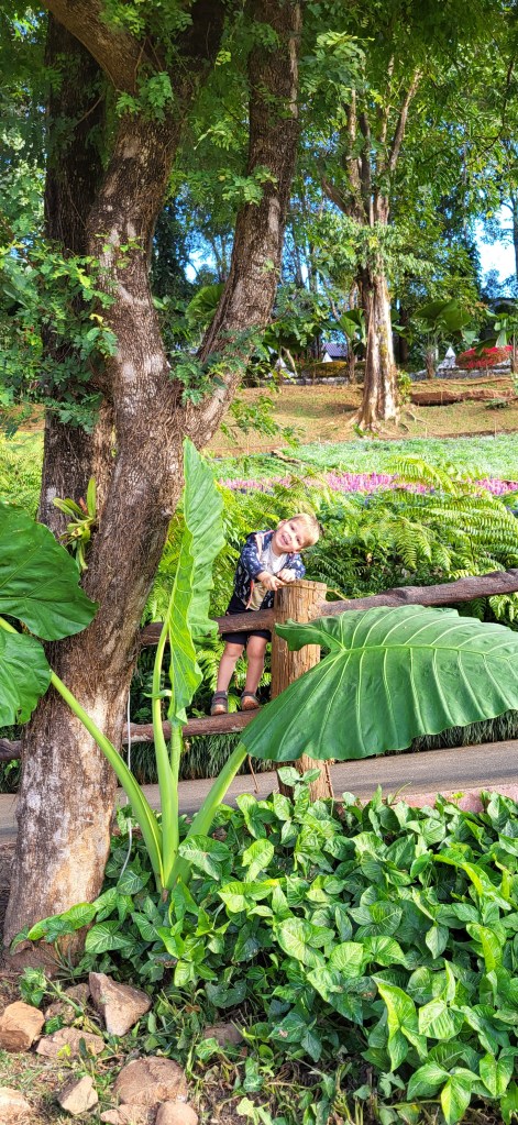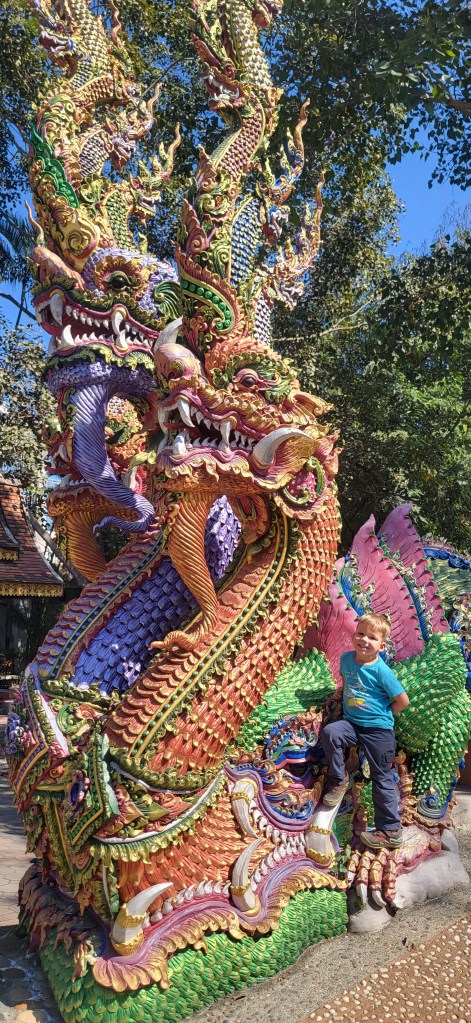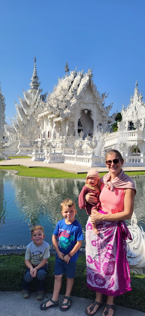 Da hier im Land kaum Christen und Kirchen zu finden sind, merkt man auch von Weihnachten nichts. Gelegentlich in manchen westlichen Geschäften oder Restaurants bekommen wir Weihnachtslieder zu hören oder sehen einen geschmückten Tannenbaum, was bei den warmen Temperaturen aber eher seltsam anmutet. Die Weihnachtstage verbringen wir in einem kleinen gemütlichen Ferienhaus und statt großer Bescherung beschenken wir uns seit nunmehr sieben Wochen jeden Tag mit vielen kleinen Leckereien, Ausflügen, Erlebnissen und tollen Momenten. Ein Wenig vermissen wir Familie und Freunde dennoch und sind um die Weihnachtstage leider fast alle leicht erkältet. In Chiang Rai finden wir einen deutschen Bäcker und freuen uns sehr über die leckeren Laugenstangen. Abends nehmen wir an einem typisch thailändischen Grillbuffet teil, bei dem wir zum Grillfleisch auch Gemüse und Nudeln im Topf garen können. Neben den Tempelanlagen besuchen wir einen botanischen Garten und wie fast jeden Abend die verschiedenen Nachtmärkte, die für uns wie Weihnachtsmärkte geworden sind. Anstatt Glühwein und Bratwurst gibt es hier Frucht Smoothie und Padtai 😉