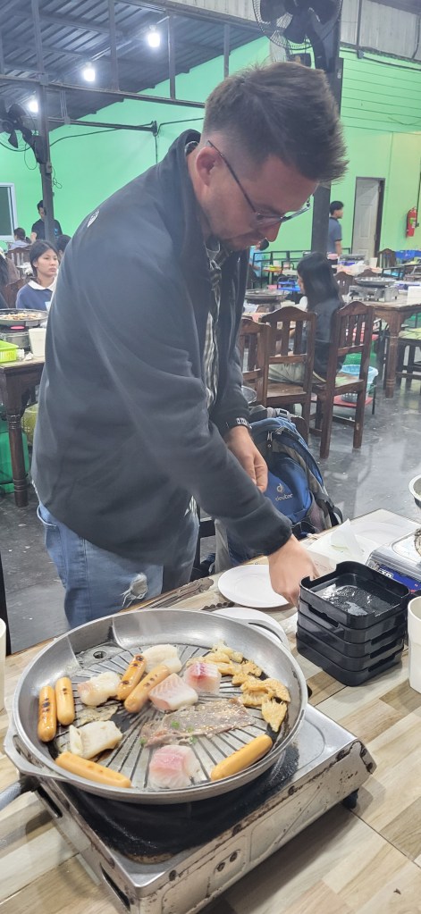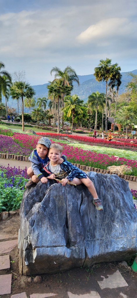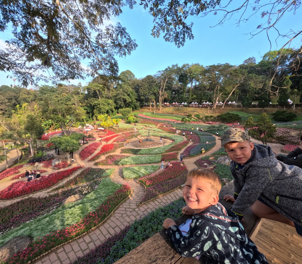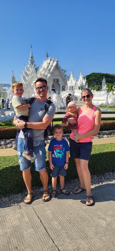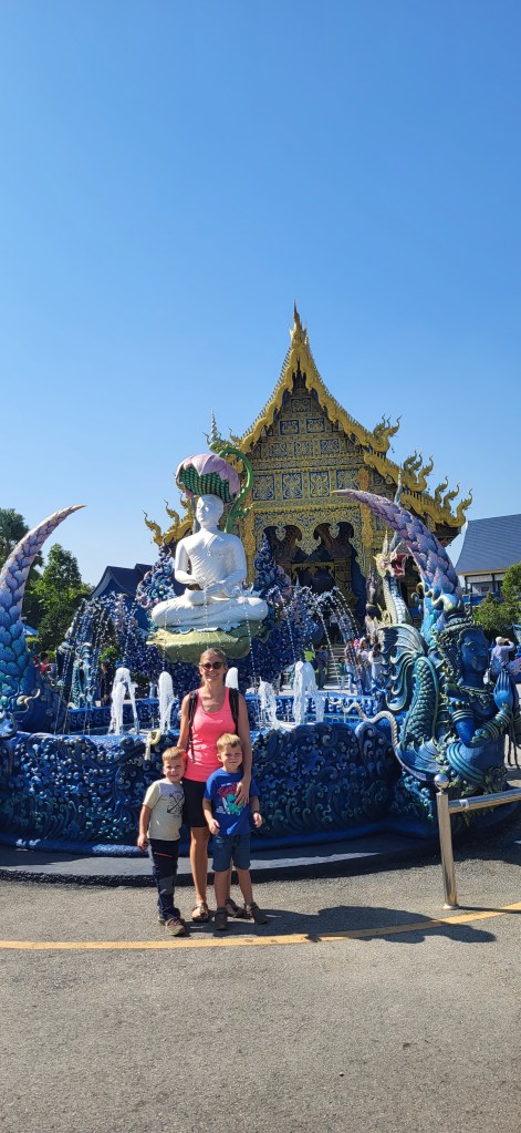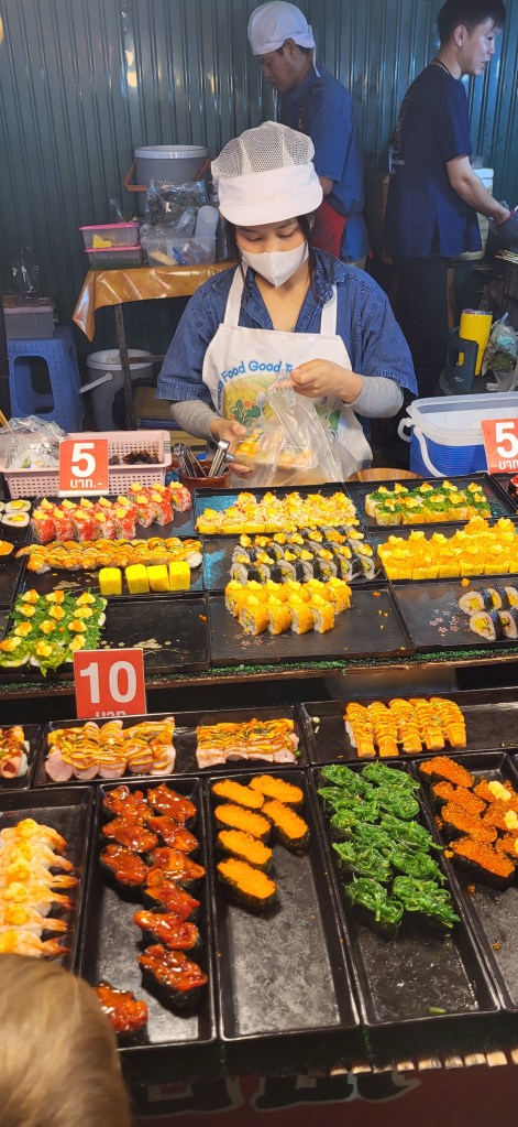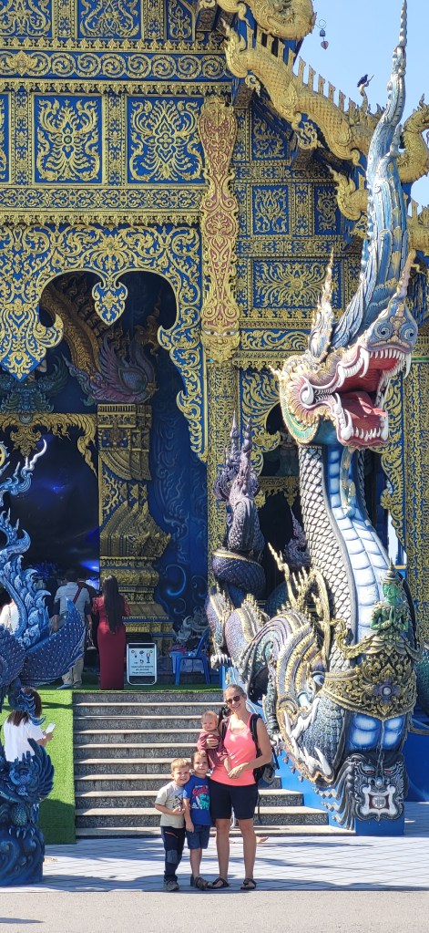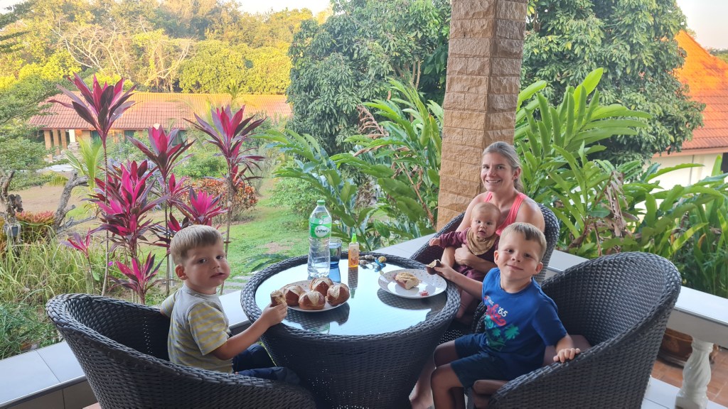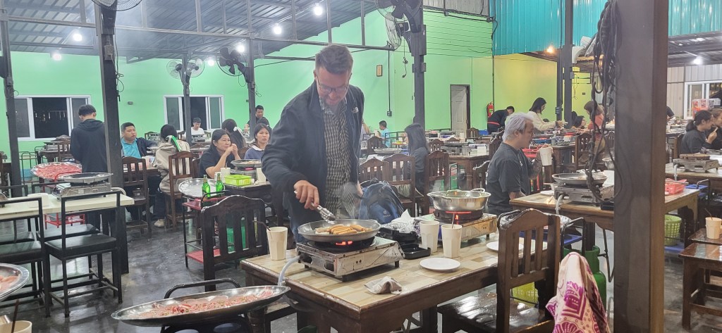 Da hier im Land kaum Christen und Kirchen zu finden sind, merkt man auch von Weihnachten nichts. Gelegentlich in manchen westlichen Geschäften oder Restaurants bekommen wir Weihnachtslieder zu hören oder sehen einen geschmückten Tannenbaum, was bei den warmen Temperaturen aber eher seltsam anmutet. Die Weihnachtstage verbringen wir in einem kleinen gemütlichen Ferienhaus und statt großer Bescherung beschenken wir uns seit nunmehr sieben Wochen jeden Tag mit vielen kleinen Leckereien, Ausflügen, Erlebnissen und tollen Momenten. Ein Wenig vermissen wir Familie und Freunde dennoch und sind um die Weihnachtstage leider fast alle leicht erkältet. In Chiang Rai finden wir einen deutschen Bäcker und freuen uns sehr über die leckeren Laugenstangen. Abends nehmen wir an einem typisch thailändischen Grillbuffet teil, bei dem wir zum Grillfleisch auch Gemüse und Nudeln im Topf garen können. Neben den Tempelanlagen besuchen wir einen botanischen Garten und wie fast jeden Abend die verschiedenen Nachtmärkte, die für uns wie Weihnachtsmärkte geworden sind. Anstatt Glühwein und Bratwurst gibt es hier Frucht Smoothie und Padtai 😉