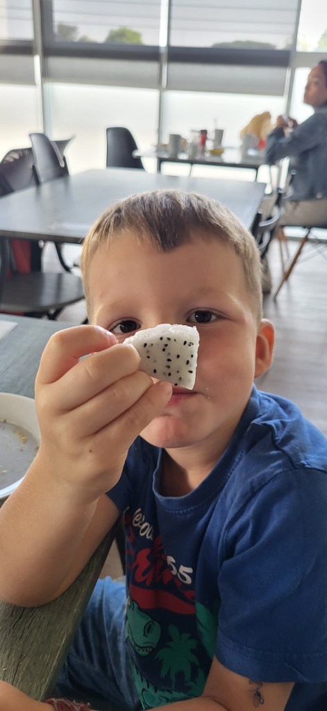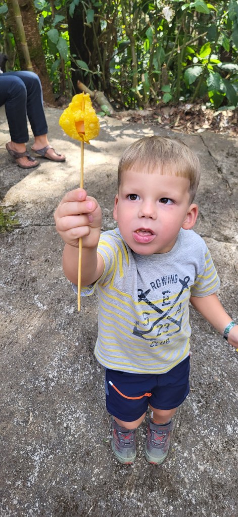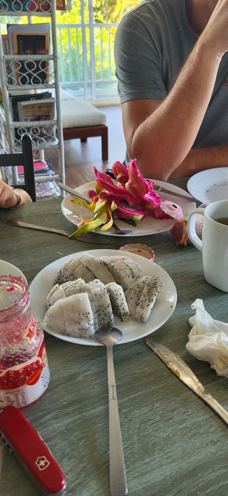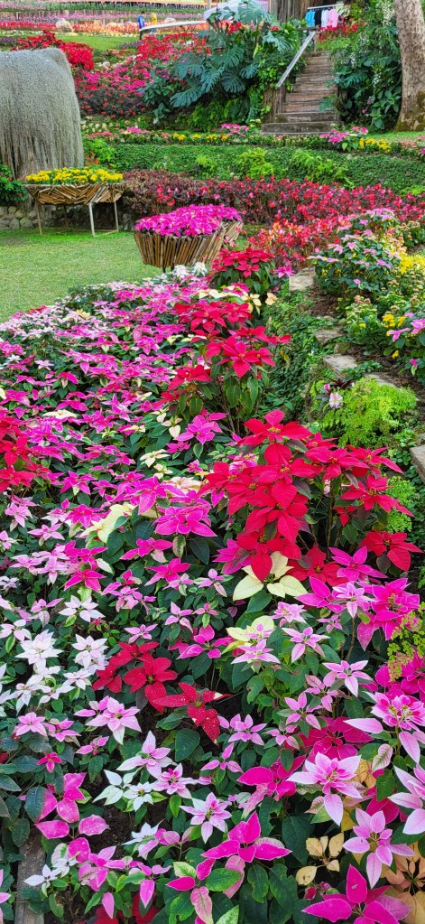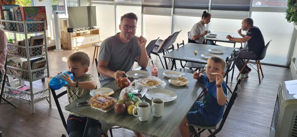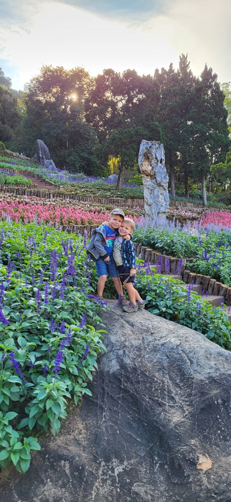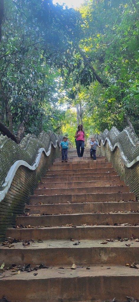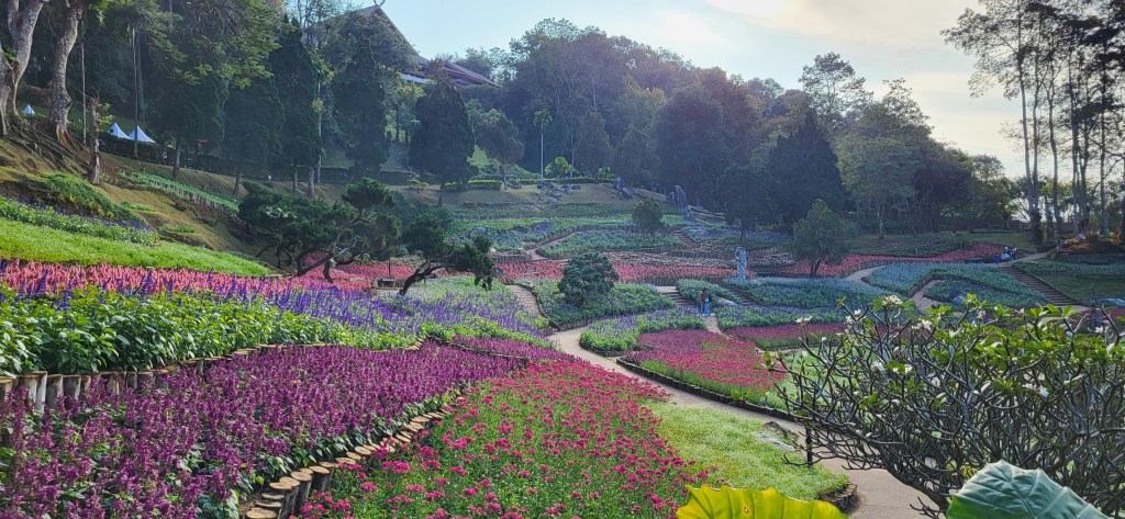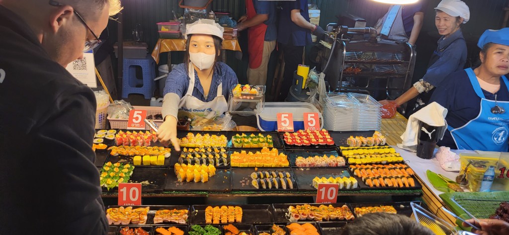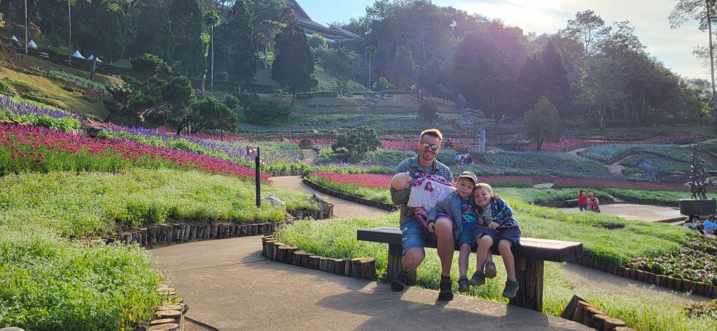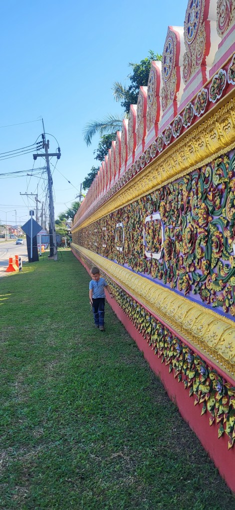 Da hier im Land kaum Christen und Kirchen zu finden sind, merkt man auch von Weihnachten nichts. Gelegentlich in manchen westlichen Geschäften oder Restaurants bekommen wir Weihnachtslieder zu hören oder sehen einen geschmückten Tannenbaum, was bei den warmen Temperaturen aber eher seltsam anmutet. Die Weihnachtstage verbringen wir in einem kleinen gemütlichen Ferienhaus und statt großer Bescherung beschenken wir uns seit nunmehr sieben Wochen jeden Tag mit vielen kleinen Leckereien, Ausflügen, Erlebnissen und tollen Momenten. Ein Wenig vermissen wir Familie und Freunde dennoch und sind um die Weihnachtstage leider fast alle leicht erkältet. In Chiang Rai finden wir einen deutschen Bäcker und freuen uns sehr über die leckeren Laugenstangen. Abends nehmen wir an einem typisch thailändischen Grillbuffet teil, bei dem wir zum Grillfleisch auch Gemüse und Nudeln im Topf garen können. Neben den Tempelanlagen besuchen wir einen botanischen Garten und wie fast jeden Abend die verschiedenen Nachtmärkte, die für uns wie Weihnachtsmärkte geworden sind. Anstatt Glühwein und Bratwurst gibt es hier Frucht Smoothie und Padtai 😉