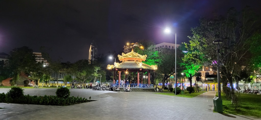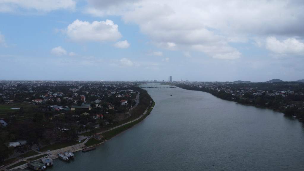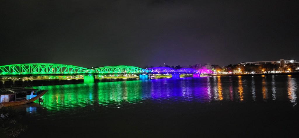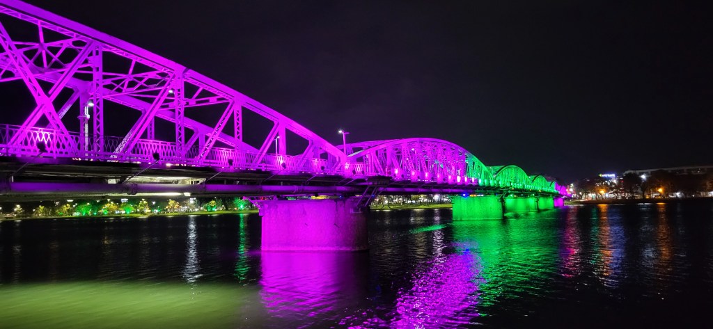 In Hue angekommen beziehen wir alle gemeinsam ein kleines gemütliches Hotel direkt in der Innenstadt. Hier reihen sich viele Bars, Cafés, Shops und Restaurants aneinander und wir können mal wieder viel zu Fuß erkunden. Z.B. die ab abends angeleuchtete Eisenbahnbrücke, die über den mächtigen Song Huong Fluss führt.