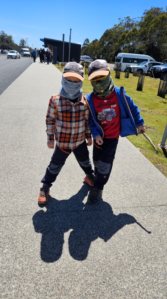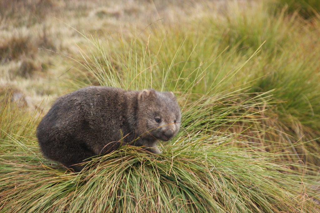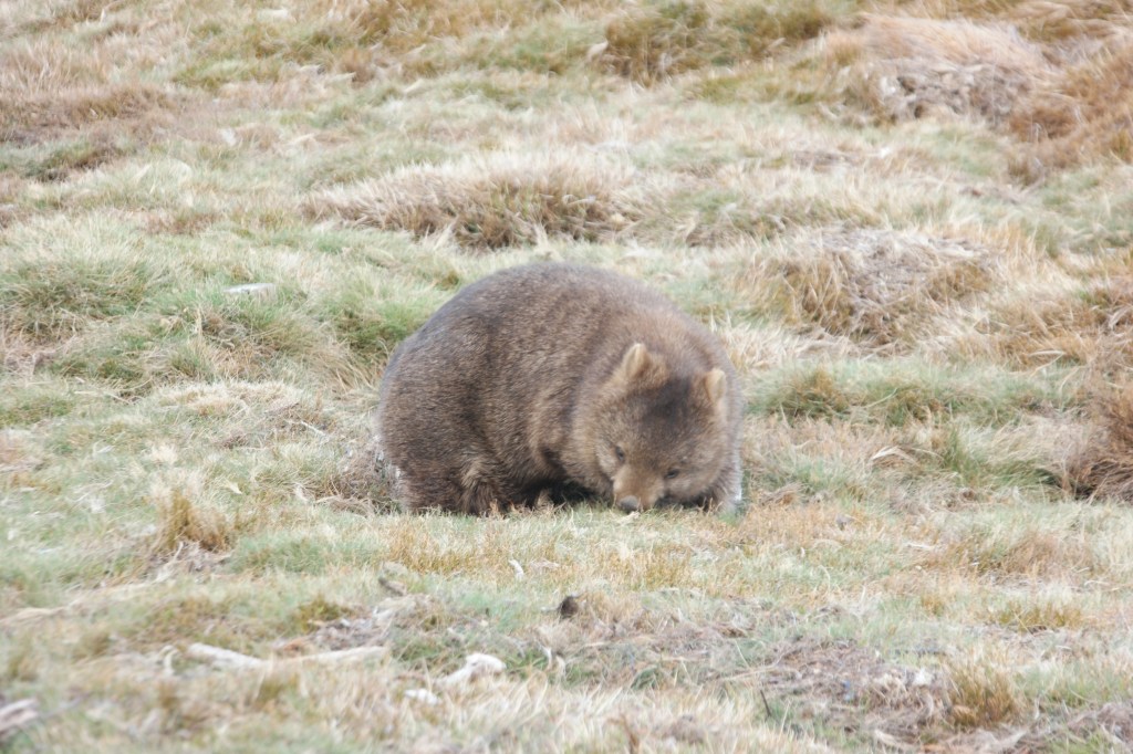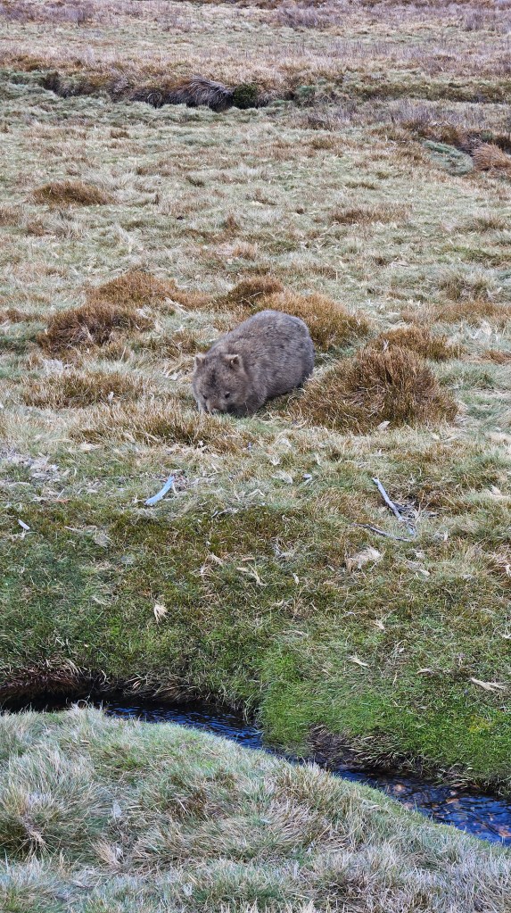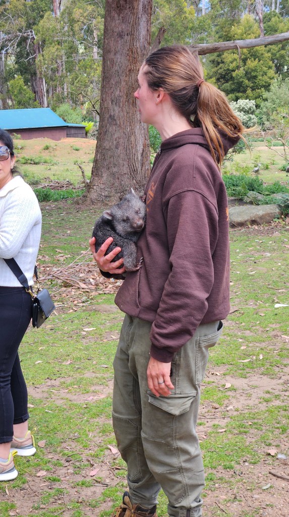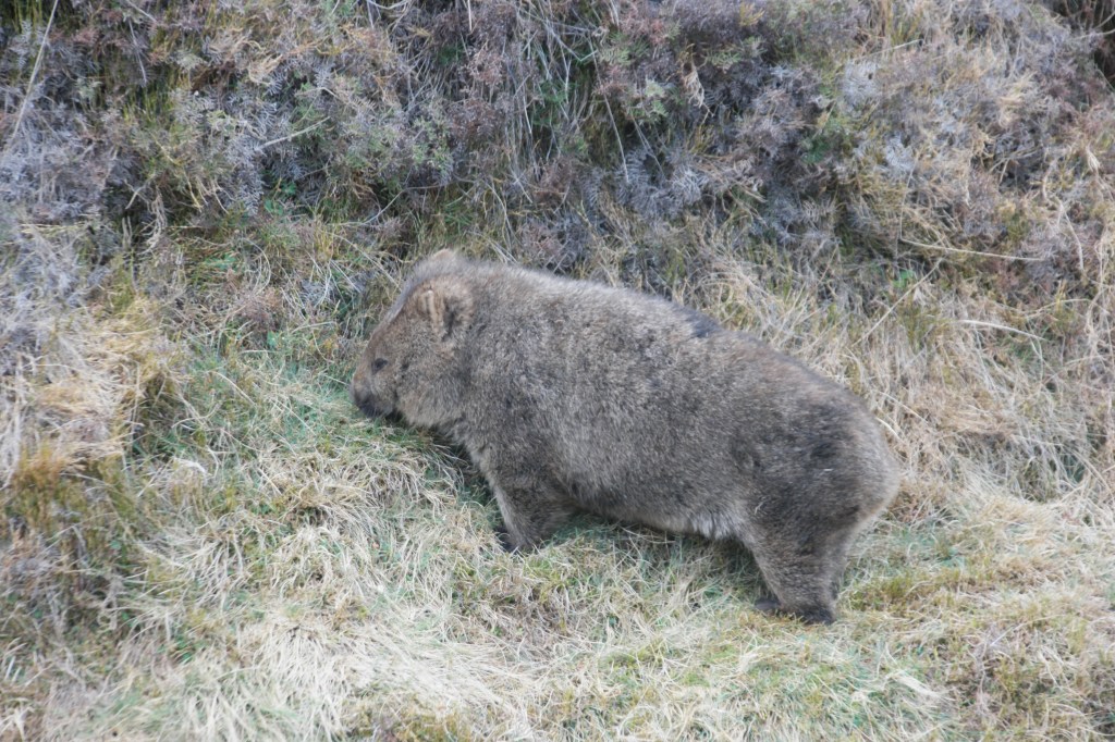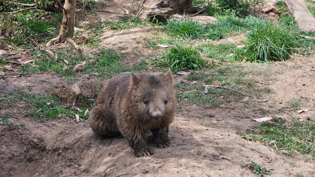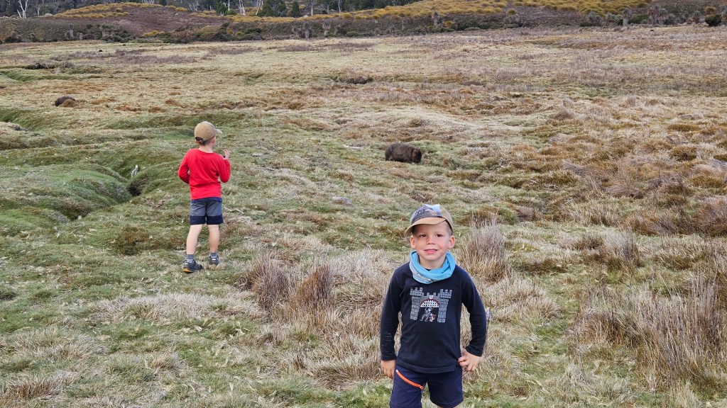Unsere Wanderung führt uns weiter in felsigere Gefilde und für Emil und Theo in ein Kletterparadies. Wo es die Wege zuließen durfte Käthe klettern und balancieren. In der Abenddämmerung und kurz vor Abfahrt des letzten Shuttlebusses durften wir noch zahlreiche Wombats entdecken, die sprichwörtlich aus allen Löchern gekrochen kamen. Die abend- und nachtaktiven Tiere sehen aus wie große pelzige Meerschweinchen und wirken friedlich und gemütlich, können aber bei Bedrohung bis zu 40 km/h schnell flitzen. Sie bauen bis zu 25m lange Tunnelsysteme die bis zu 3m unter der Erde sein können, bei Gefahr verschließen die den Tunneleingang mit ihrem Hinterteil und treten den potentiellen Angreifer mit den Hinterbeinen.
