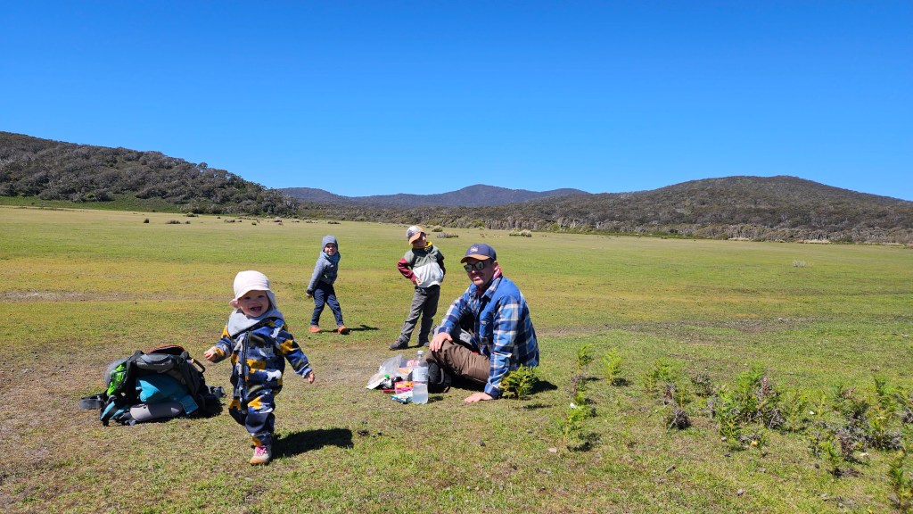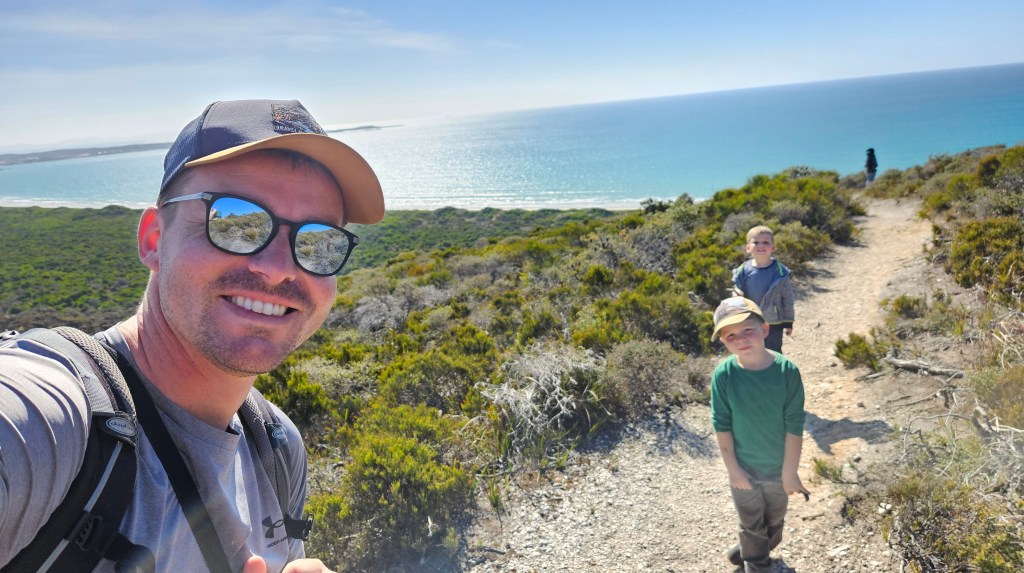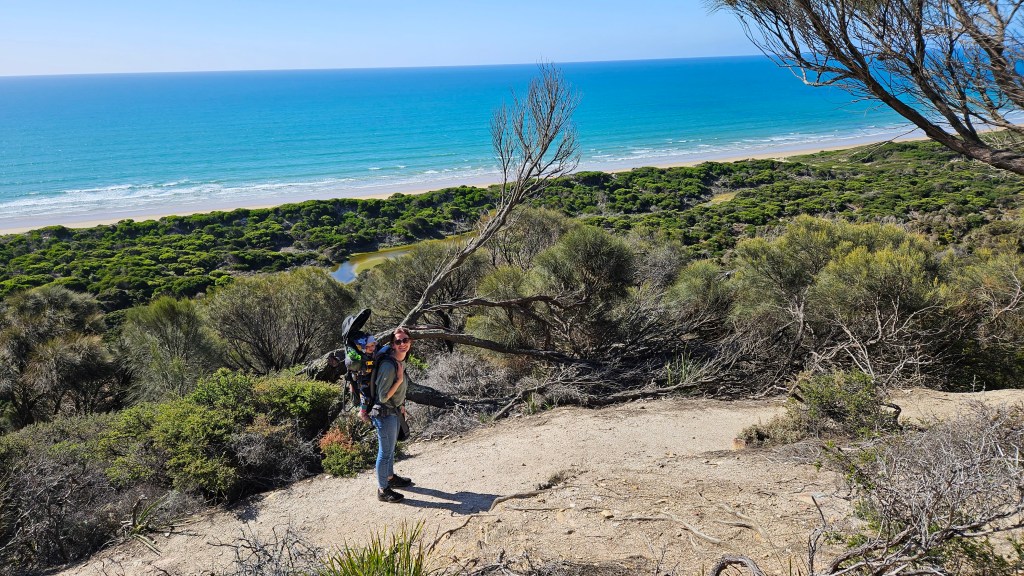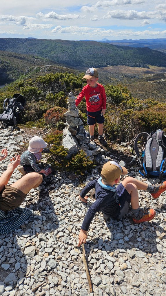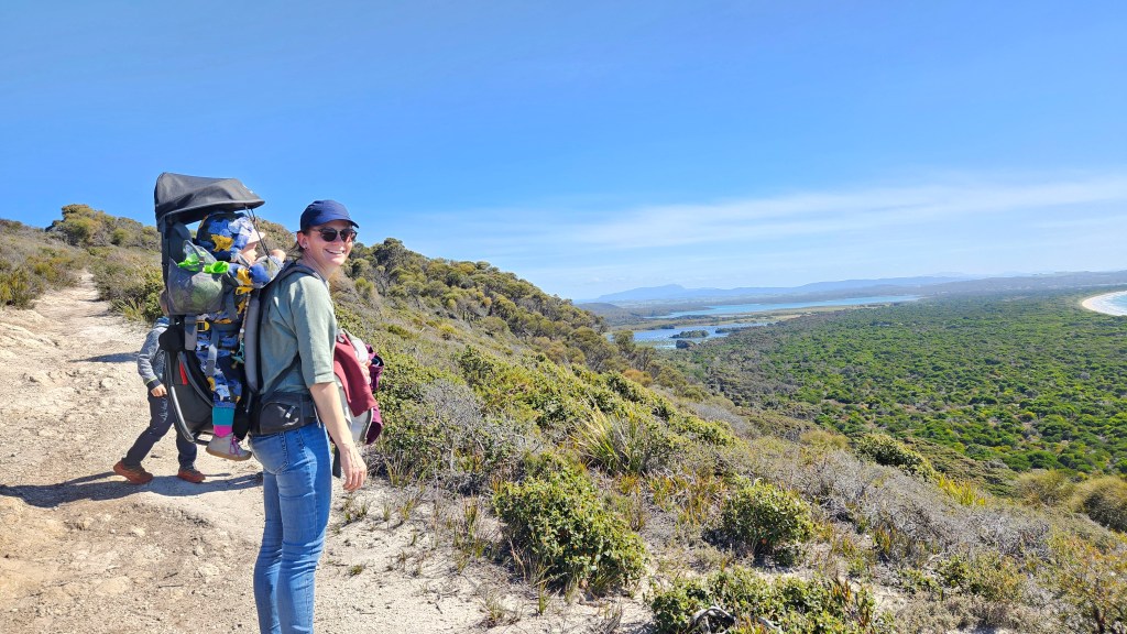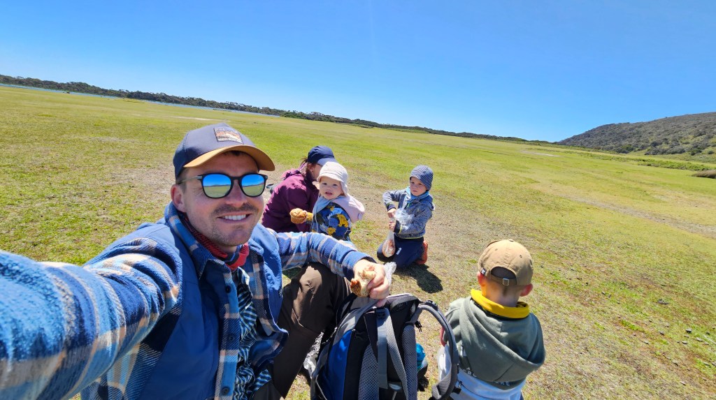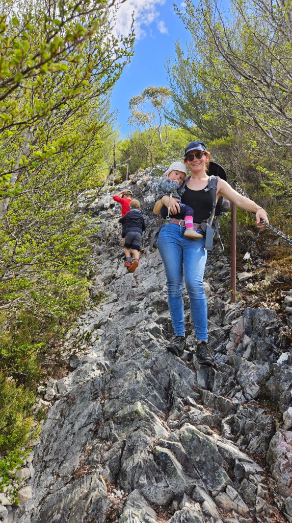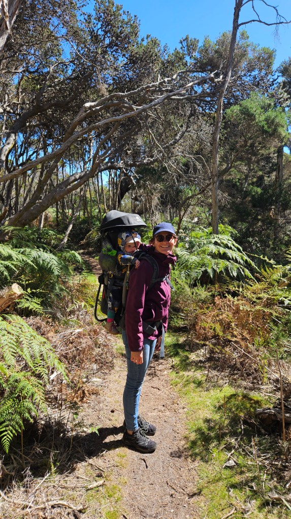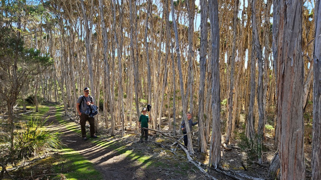 Unsere Wanderung führt uns weiter in felsigere Gefilde und für Emil und Theo in ein Kletterparadies. Wo es die Wege zuließen durfte Käthe klettern und balancieren. In der Abenddämmerung und kurz vor Abfahrt des letzten Shuttlebusses durften wir noch zahlreiche Wombats entdecken, die sprichwörtlich aus allen Löchern gekrochen kamen. Die abend- und nachtaktiven Tiere sehen aus wie große pelzige Meerschweinchen und wirken friedlich und gemütlich, können aber bei Bedrohung bis zu 40 km/h schnell flitzen. Sie bauen bis zu 25m lange Tunnelsysteme die bis zu 3m unter der Erde sein können, bei Gefahr verschließen die den Tunneleingang mit ihrem Hinterteil und treten den potentiellen Angreifer mit den Hinterbeinen.