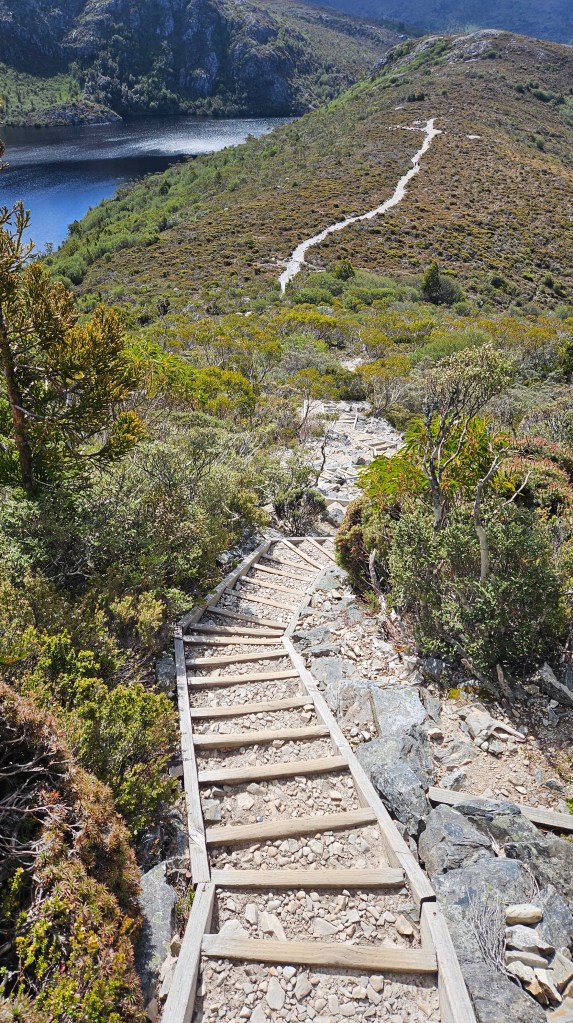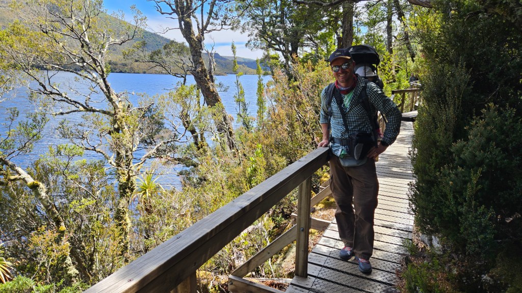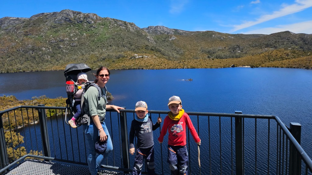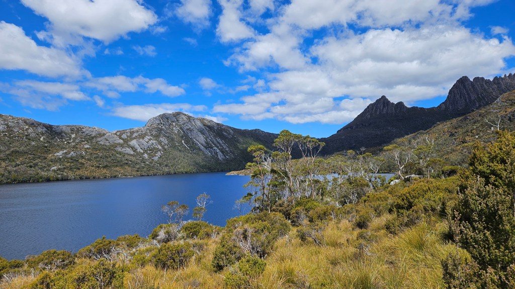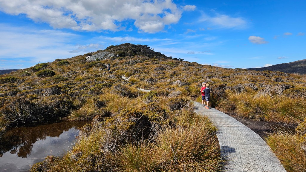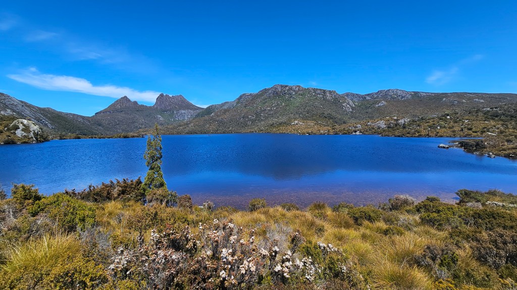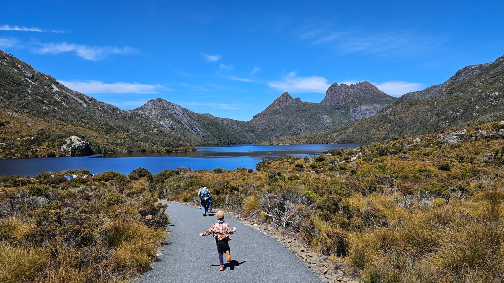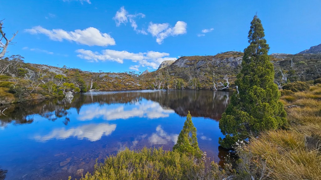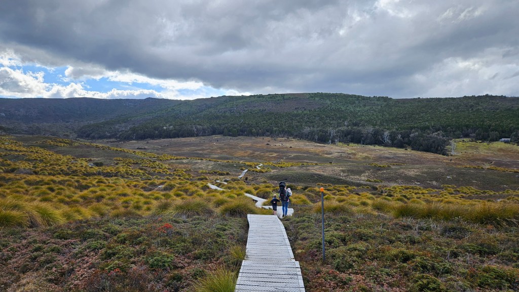 Das Highlight eines jeden Aufenthalts auf Tasmanien ist sicherlich das Hochland rund um den Cradle Mountain im zentralen Bergland. Hier gibt es unzählige Wandermöglichkeiten und auch Mehrtagestouren. Im sehr gut organisierten Visitorcenter bekommen wir viele nützliche Infos und es gibt einen Shuttlebus, der verschiedene Spots anfährt. Wir haben Glück mit dem Wetter und unternehmen eine Wanderung um den Dove Lake. Die Farbvielfalt der Vegetation und Bergkulissen sind atemberaubend und wir spazieren meist über Holzblanken durch beeindruckende Natur. Weniger beeindrucken lies sich eine schwarze Tiegerotter, die 2m neben dem Weg züngelnd auf Beutesuche war und dessen Gift so potent ist, dass sie im Ranking den fünften Platz der gefährlichsten Schlangen Weltweit einnimmt. Leider haben wir sie nicht komplett aufs Fotos bekommen, hatten allerdings auch einen erhöhten Puls in dem Moment und waren auf Abstand bedacht.