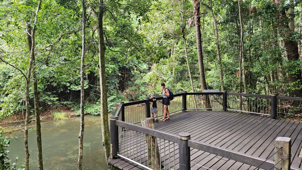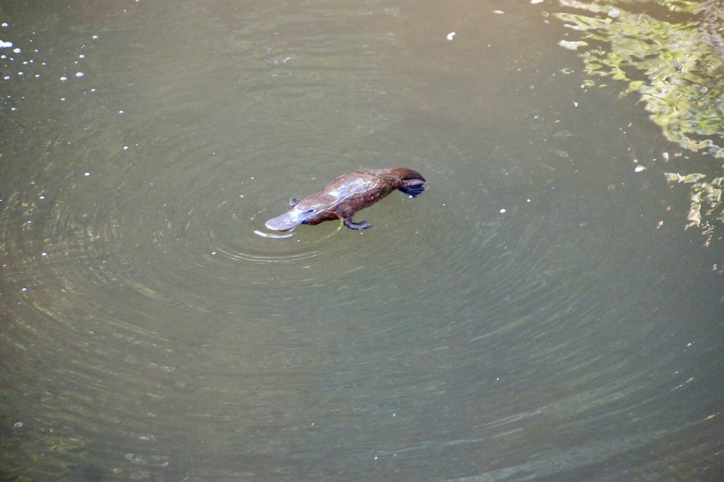 Am Nikolaustag unternehmen wir eine Expedition in Richtung Eungella Nationalpark und wollen das nur in Australien vorkommende Schnabeltier in freier Wildbahn aufsuchen. Nicht ganz so leicht, denn die Tiere sind scheu und kommen nur in manchen kleineren Seen und Flüssen vor. Sie sind neben dem Schnabeligel das einzige Säugetier, welches Eier legt und äußerlich einzigartige Erscheinungen. Wie wir finden eine Mischung aus Otter, Bieber und Ente. Wir sind den ganzen Tag entlang des Pioneer Flusses unterwegs und tatsächlich Nachmittags, in höheren Lagen, an einem kleinen Tümpel haben wir Glück. Beim längeren Beobachten, werden wir von Anderen gewarnt, dass sich eine Braunschlange soeben aus dem Tümpel begeben hat und sich im hohen Gras versteckt hält. Wir sind nicht erpicht auf eine Bekanntschaft und ziehen uns langsam zurück.