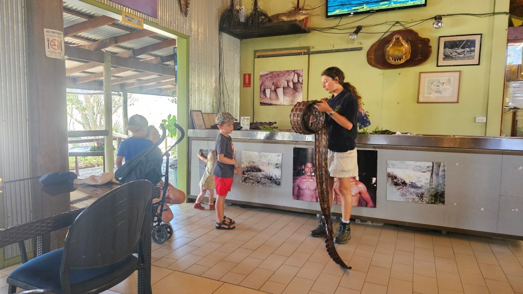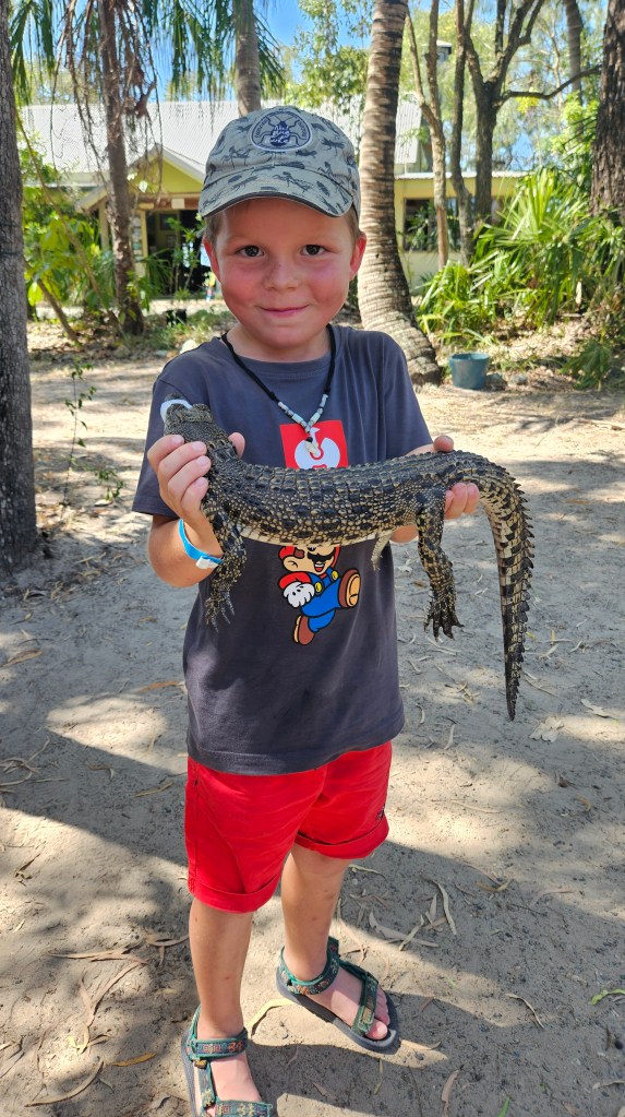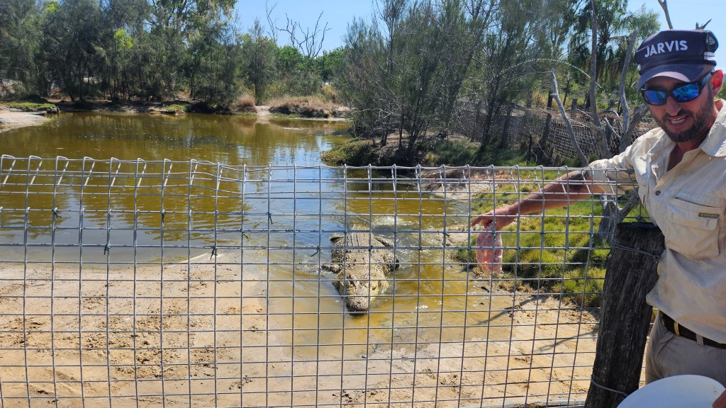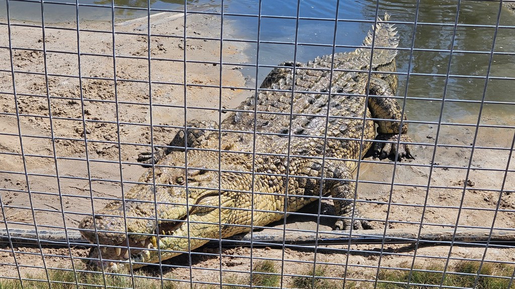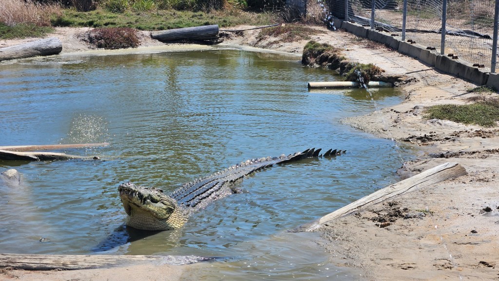 Eigentlich wollten wir von Rockhampton aus einen Tagesausflug zur Great Keppel Island machen, entscheiden uns aber kurzfristig für einen Ausflug zur Koorana Krokodil Farm. Etwas unsicher, ob wir eine Farm auf der Krokodile gezüchtet werden gut oder schlecht finden sollen, wollen wir uns ein eigenes Bild machen. Die weltweite Nachfrage nach Krokodilfleisch und Leder ist weiterhin hoch und man hatte in der Vergangenheit durch Jagd, die Anzahl der frei-lebenden australischen Leistenkrokodile von 300.000 auf 3.000 dramatisch reduziert. Durch erfolgreiche Aufzuchten und Auswilderungen hat sich der Bestand wieder erholt (aktuell ca 230.000) und man geht den frei lebenden Tieren dank ihrer Artgenossen in den Farmen nicht mehr ans Leder. Wir lernen an diesem Tag sehr viele interessante Fakten, wie z.B. dass ihr Rückenpanzer die Sonnenenergie speichert und sie nachts warm hält oder dass das Alphamännchen die Anzahl der anderen Männchen reguliert je nachdem wie groß das Nahrungsangebot im Revier ist. Die Weibchen bewachen ihr Nest 3 Monate und transportieren ihre Jungen nach dem Schlüpfen vorsichtig im Maul ins Wasser. Mit dem gleichen Maul können sie Beute zerreißen und einen Druck aufbauen, der 5 Bowlingkugeln zerquetschen würde. Eigentlich stehen wir Menschen nicht auf ihrem Speiseplan, aber durch Anfüttern haben manche großen Exemplare in der Wildnis die Scheu vor uns verloren.