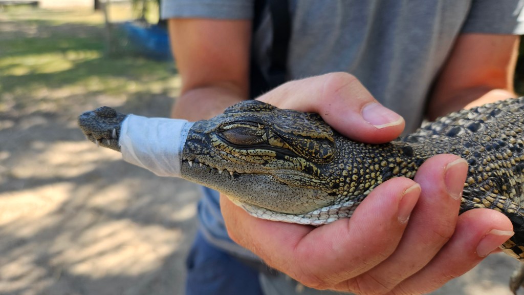 Auf der Farm ist es möglich ihnen sehr nah zu begegnen und wir sind alle beeindruckt von den an Land behäbig wirkenden Kraftpaketen, die sich unter Wasser unsichtbar machen können und bis zu 50 KM/h schnell sind.