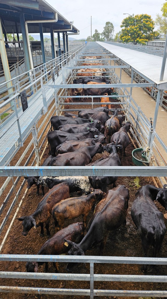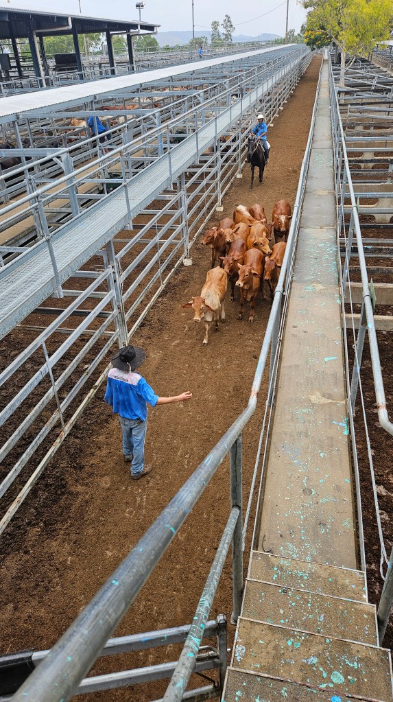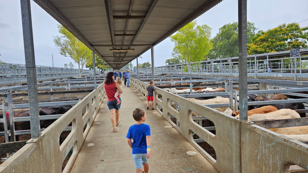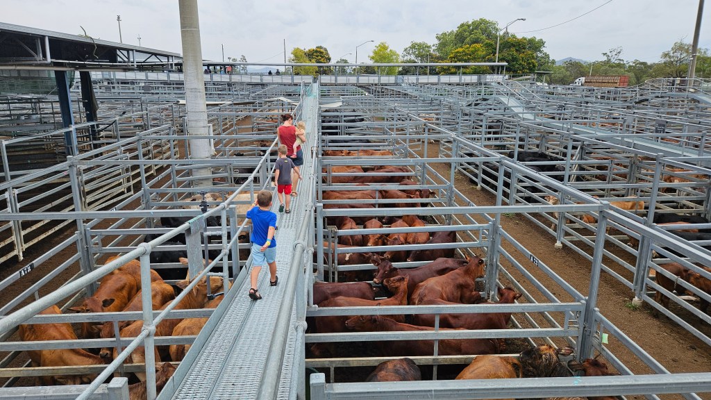 Die Region rund um Rockhampton ist für ihre vielen großen Rinderfarmen bekannt und ist Australiens Hauptstadt für Rindfleisch. Nach dem schon fast routinierten Packen und Beladen fahren wir zur Central Queensland Livestock Exchange, denn hier finden die größten Rinderauktionen Australiens statt. Kälber, Kühe und Bullen wechseln hier den Besitzer und wir mischen uns unter die einheimischen Cowboys. Die Interessenten ziehen von Gatter zu Gatter und drei Auktionatoren preisen die Kühe an und notieren die Gebote. Ständig werden neue Kühe angeliefert und Verkaufte gewogen und wieder in größere Gehege geleitet. Ein authentisches Erlebnis und die freundliche Mitarbeiter beantworten unsere Fragen.