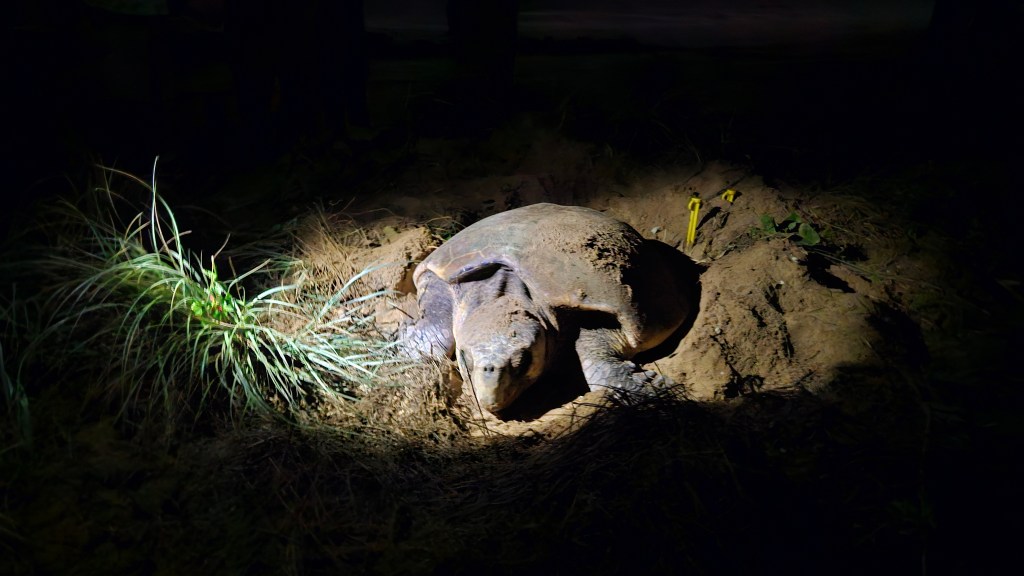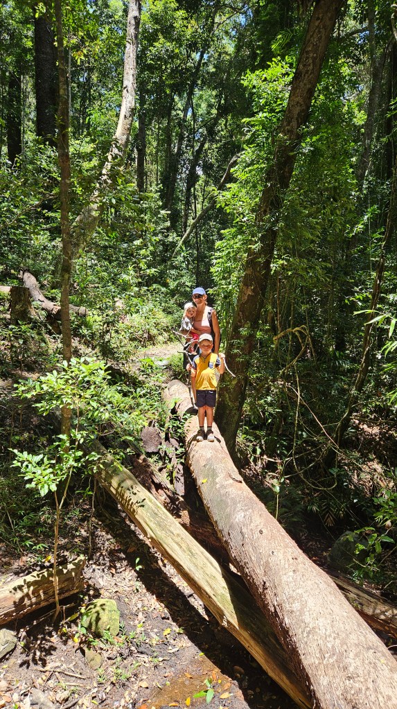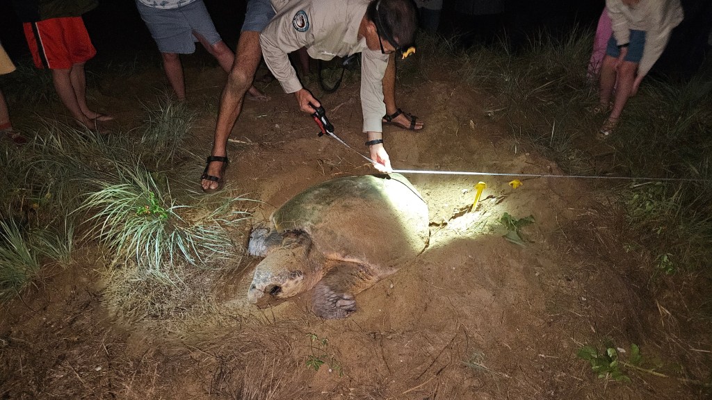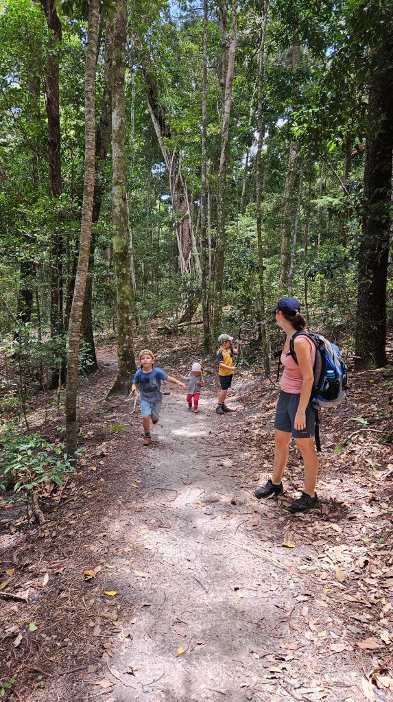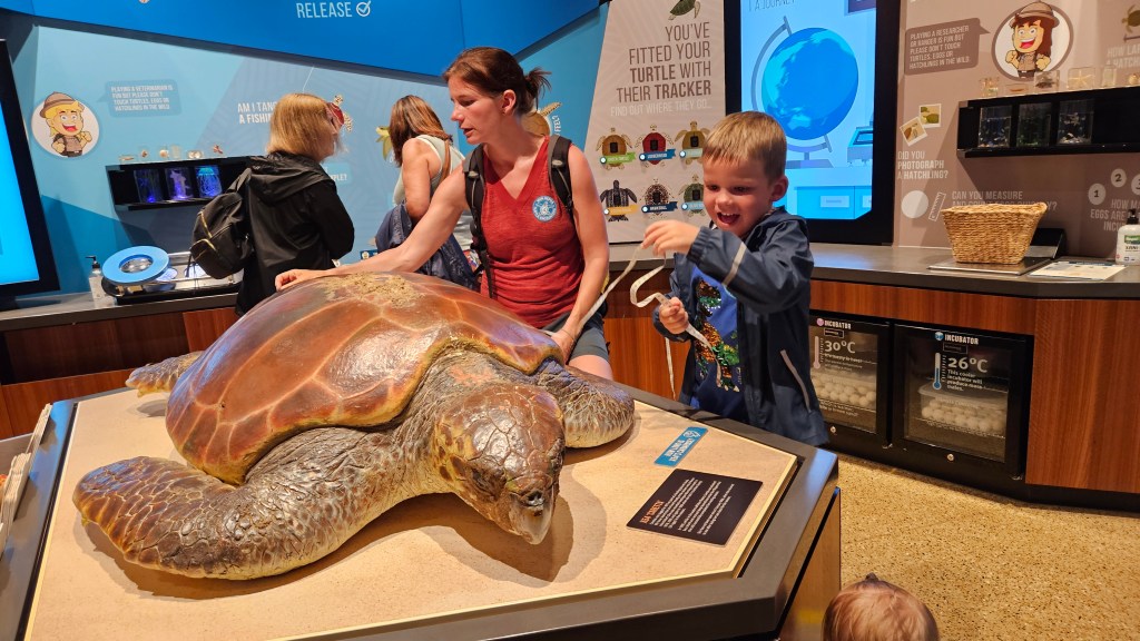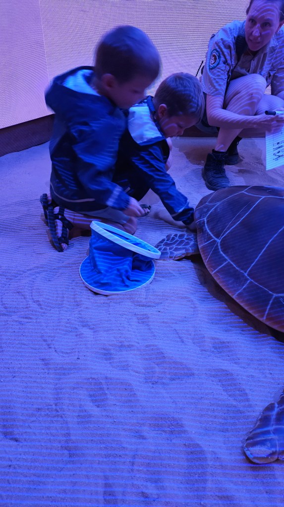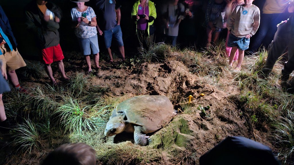 Bei Bundaberg im Mon Repos Schildkröten Center haben wir eine abendliche Tour gebucht um mit etwas Glück live dabei sein zu können, wie eine Meeresschildkröte an den Strand kommt und ihre Eier ablegt. Wir sind etwas überrascht wie viele Besucher sich abends ab 18:30 Uhr dort einfinden. Die gute Organisation, das informative Zentrum und die sehr engagierten Ranger sind super. Wir sind in der letzten Gruppe und warten ca. 2h bis sich etwas tut. In dieser Zeit dürfen die Kinder und wir spielerisch viel über die seit Jahrmillionen im Ozean lebenden Meeresschildkröten lernen. Hier an den langen Sandstränden der Ostküste kommen 50% der auf der Erde vorkommenden unechten Karettschildkröten zwischen November und Januar zur Eiablage. Etwa alle 2-3 Jahre kommen die Weibchen (ca. 100 KG schwer und 1,20 M lang) an den Strand, an dem sie selbst geboren wurden und vergraben ihre Eier im warmen Sand. Tatsächlich haben wir Glück und gegen 21 Uhr führen uns zwei Ranger bei Mondlicht an den Strand. Natürlich ohne Taschenlampen, leise und auch erstmal nur hinter der Schildkörte bleibend dürfen wir sie beobachten. Ca. 120 Eier legt die Schildkröte in ihr Nest. Nach der Eiablage buddelt Sie die Grube wieder zu, wird von den Rangern vermessen und wir dürfen ein Foto machen. Magische Momente für uns alle und die Jungs haben hinterher noch viele Fragen. Was für ein Tag und alle schlafen im Auto schnell ein, außer Michael der fährt noch 3h bis zur neuen Unterkunft 😉