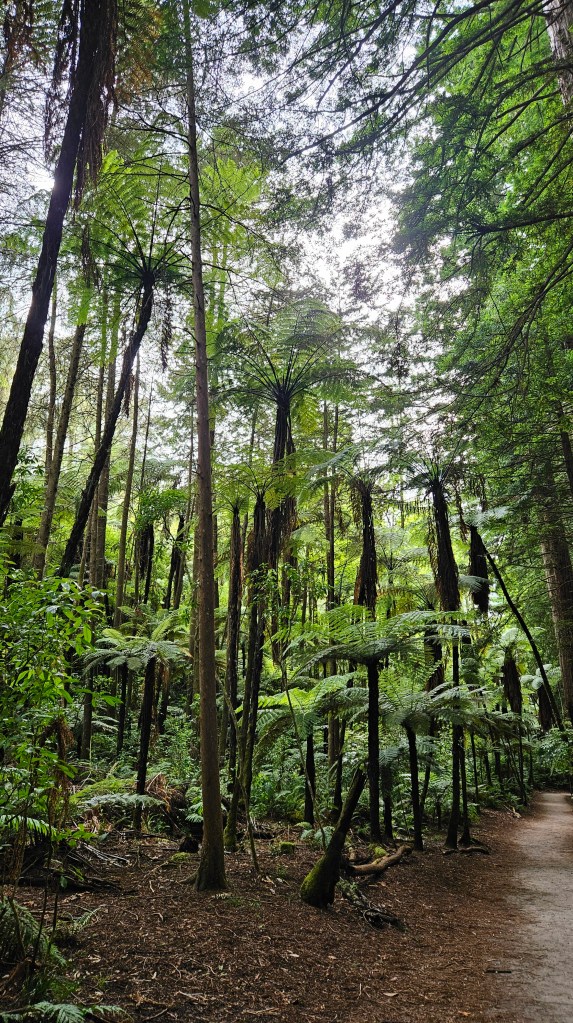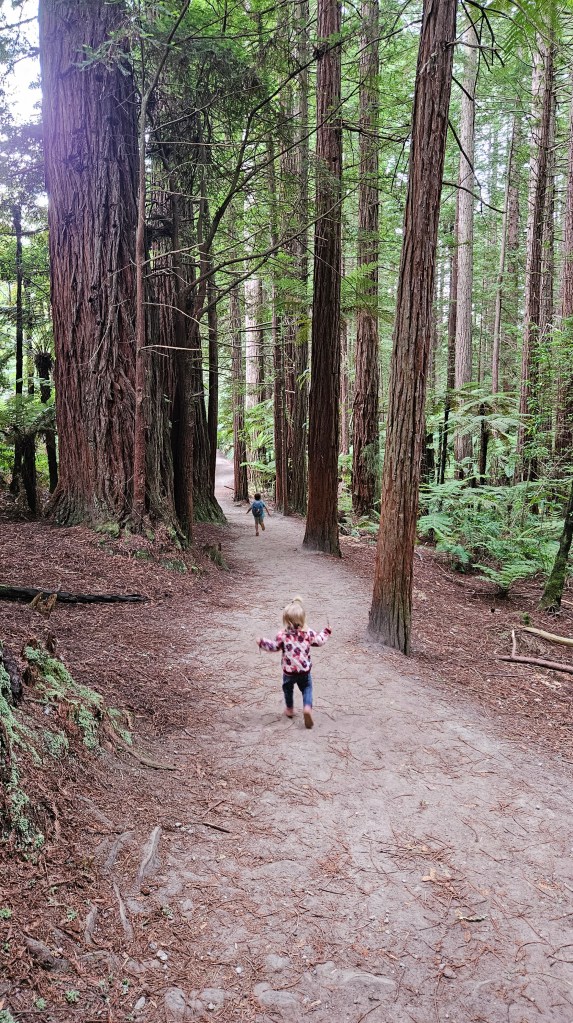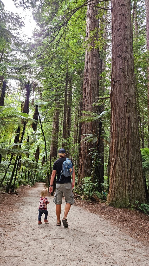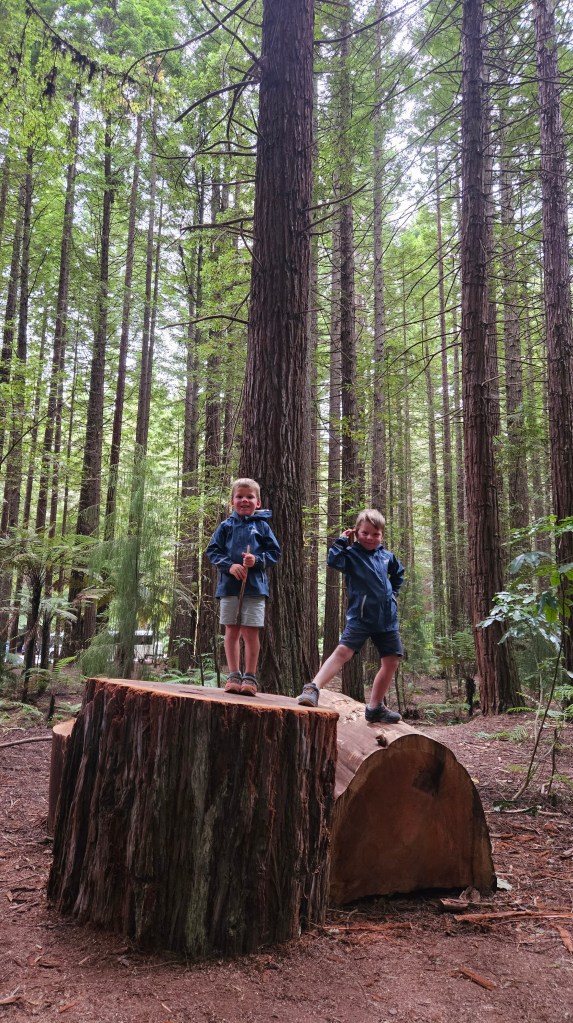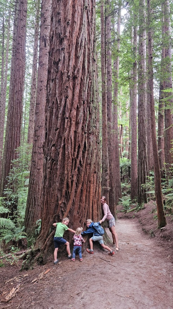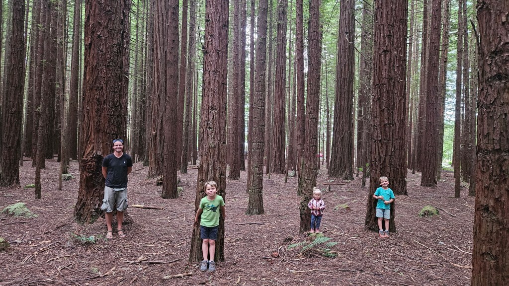 In den Wäldern rund um Rotorua sind viele alte Mammutbäume heimisch. Die rötlichen Urzeitriesen werden bis zu 150 Jahre alt, ca. 80 Meter hoch und so dick, das wir sie gemeinsam nicht umschließen können. Nördlich des Rotorua Sees in einem Waldgebiet finden wir einen schönen kostenfreien Stellplatz mit fließend Wasser und verbringen eine ruhige Nacht.