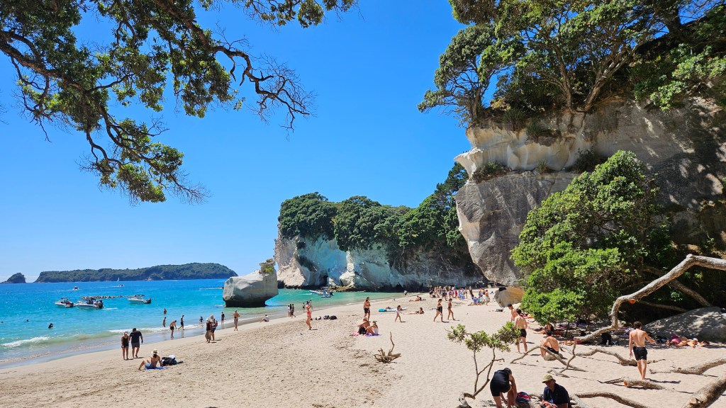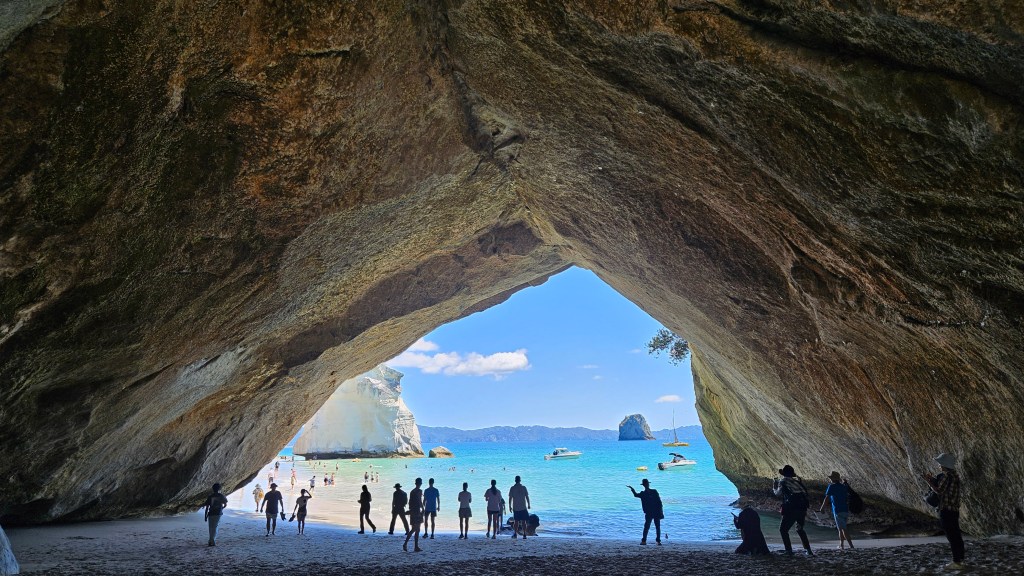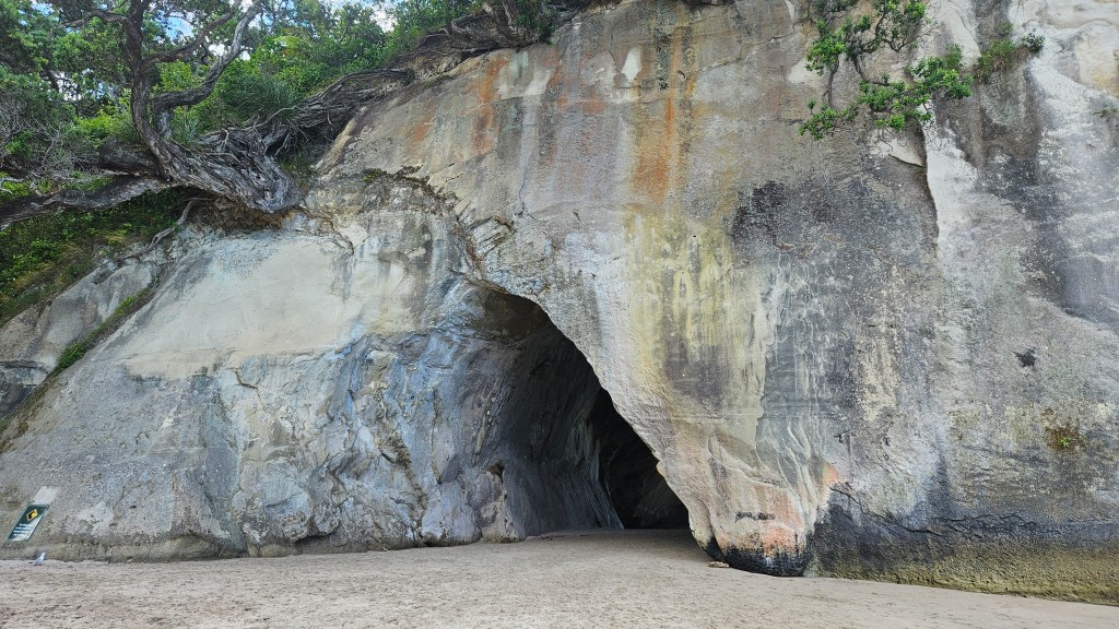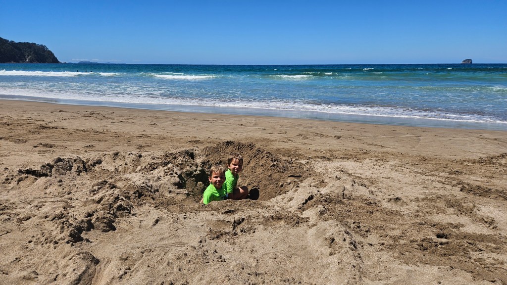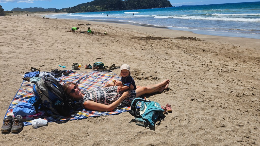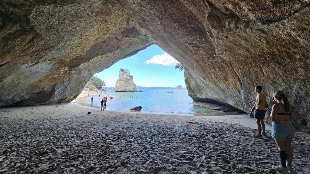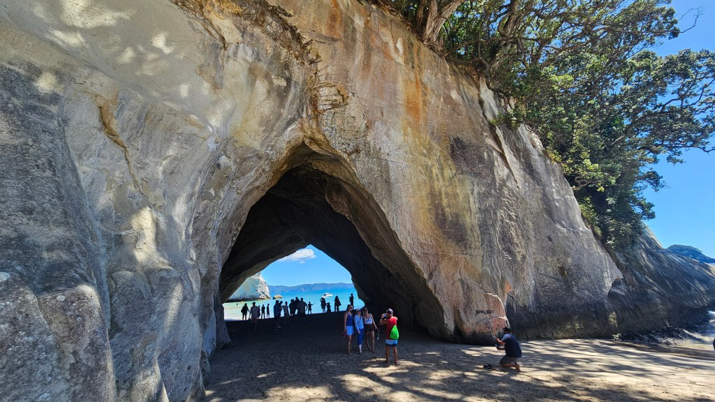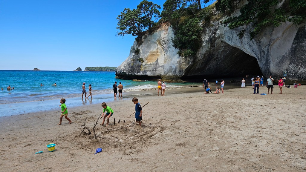 Am nächsten Tag ist es noch wärmer (ca. 27°C) und wir besuchen die Cathedral Cove, die nur zu Fuß oder per Boot zu erreichen ist. Auch hier sind wir nicht alleine und unterwegs treffen wir erneut eine deutsche Familie mit Kindern im gleichen Alter. Am Strand angekommen, wirkt die mächtige Höhle tatsächlich wie eine Kathedrale. Wir verbringen erneut einen wunderschönen Tag am Meer und tanken nochmal richtig Sonne. Abends fahren wir auf kurviger Strecke durch den Coromandel Nationalpark und verbringen die Nacht alleine auf einem abgelegenen Plätzchen.