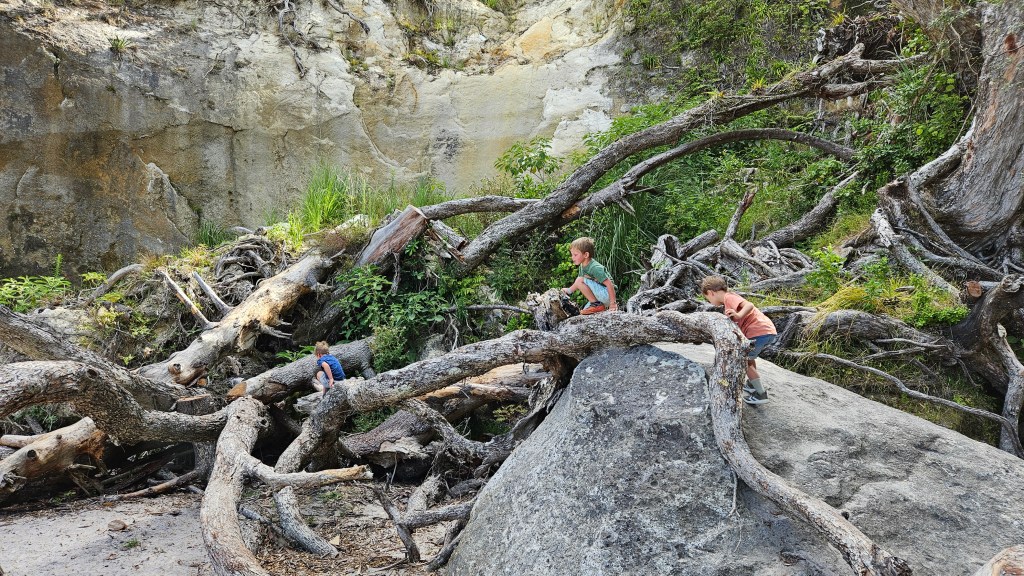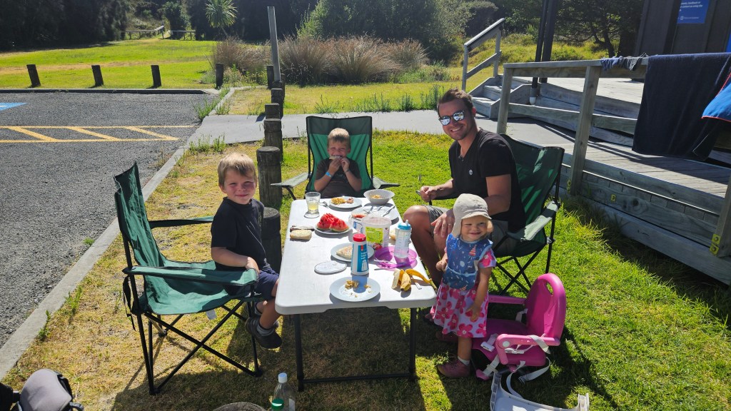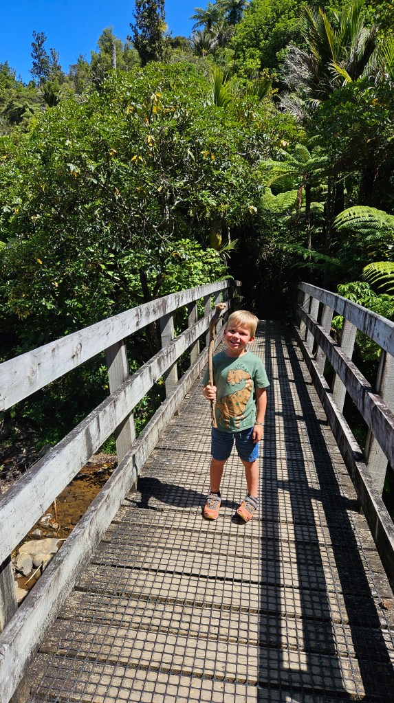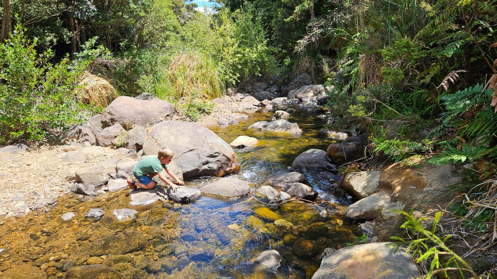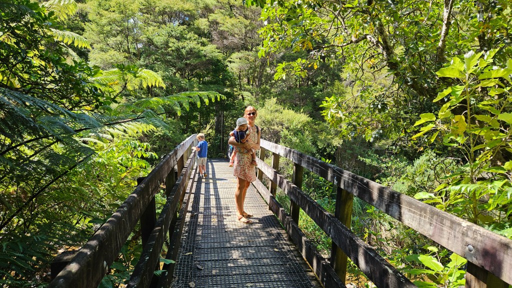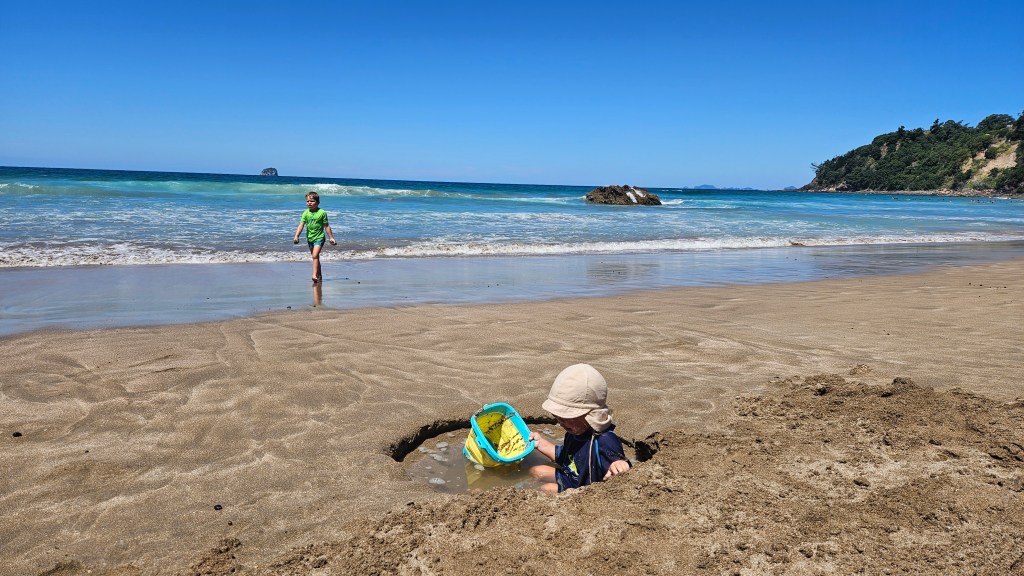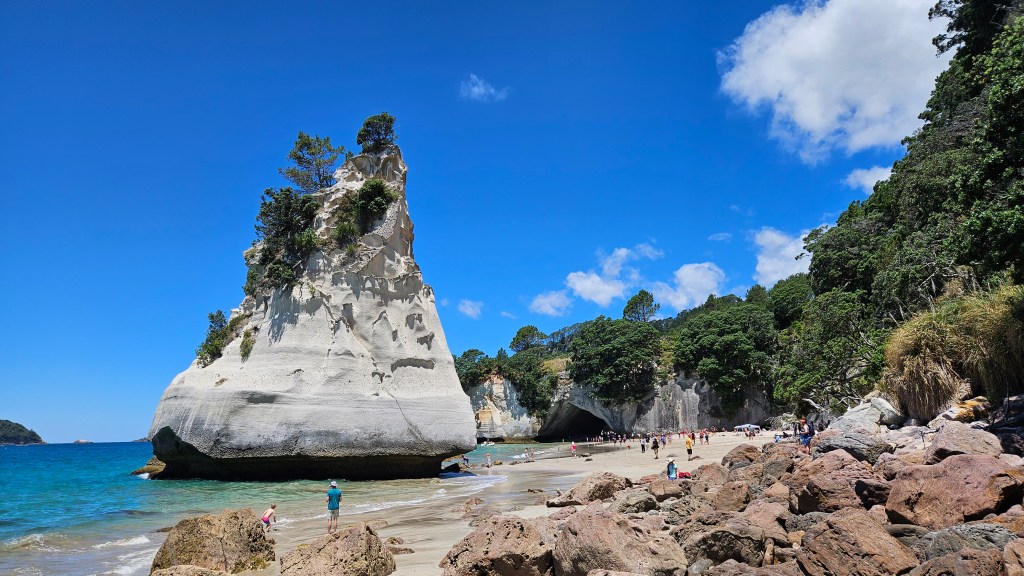 Am nächsten Tag ist es noch wärmer (ca. 27°C) und wir besuchen die Cathedral Cove, die nur zu Fuß oder per Boot zu erreichen ist. Auch hier sind wir nicht alleine und unterwegs treffen wir erneut eine deutsche Familie mit Kindern im gleichen Alter. Am Strand angekommen, wirkt die mächtige Höhle tatsächlich wie eine Kathedrale. Wir verbringen erneut einen wunderschönen Tag am Meer und tanken nochmal richtig Sonne. Abends fahren wir auf kurviger Strecke durch den Coromandel Nationalpark und verbringen die Nacht alleine auf einem abgelegenen Plätzchen.