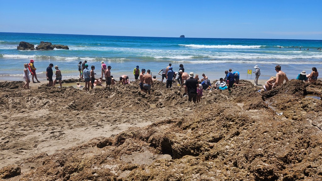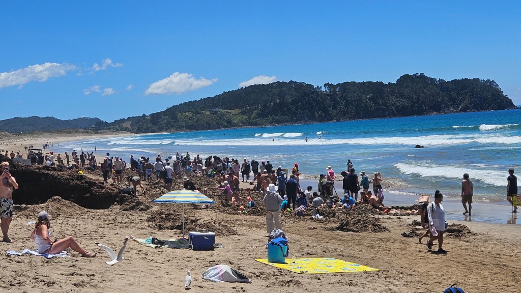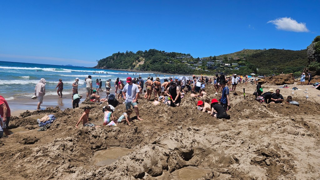 Weiter geht es in nordöstliche Richtung zur Coromandel Landzunge, vorbei an vielen Kiwi Plantagen. Am Hot Water Beach gibt es heiße Quellen, die direkt am Strand liegen. Bei Ebbe findet hier ein wahres Spektakel statt und wir treffen duzende motivierte Touristen, die mit Schaufel und Spaten ihren eigenen kleinen Pool graben. Wenn man nicht wüsste was hier von statten geht, könnte man denken, dass hier die Weltmeisterschaften im Sandburg bauen stattfinden. Etwas abseits des Trubels verbringen wir schöne Stunden am Strand und am frühen Abend springen wir noch in den Pool.